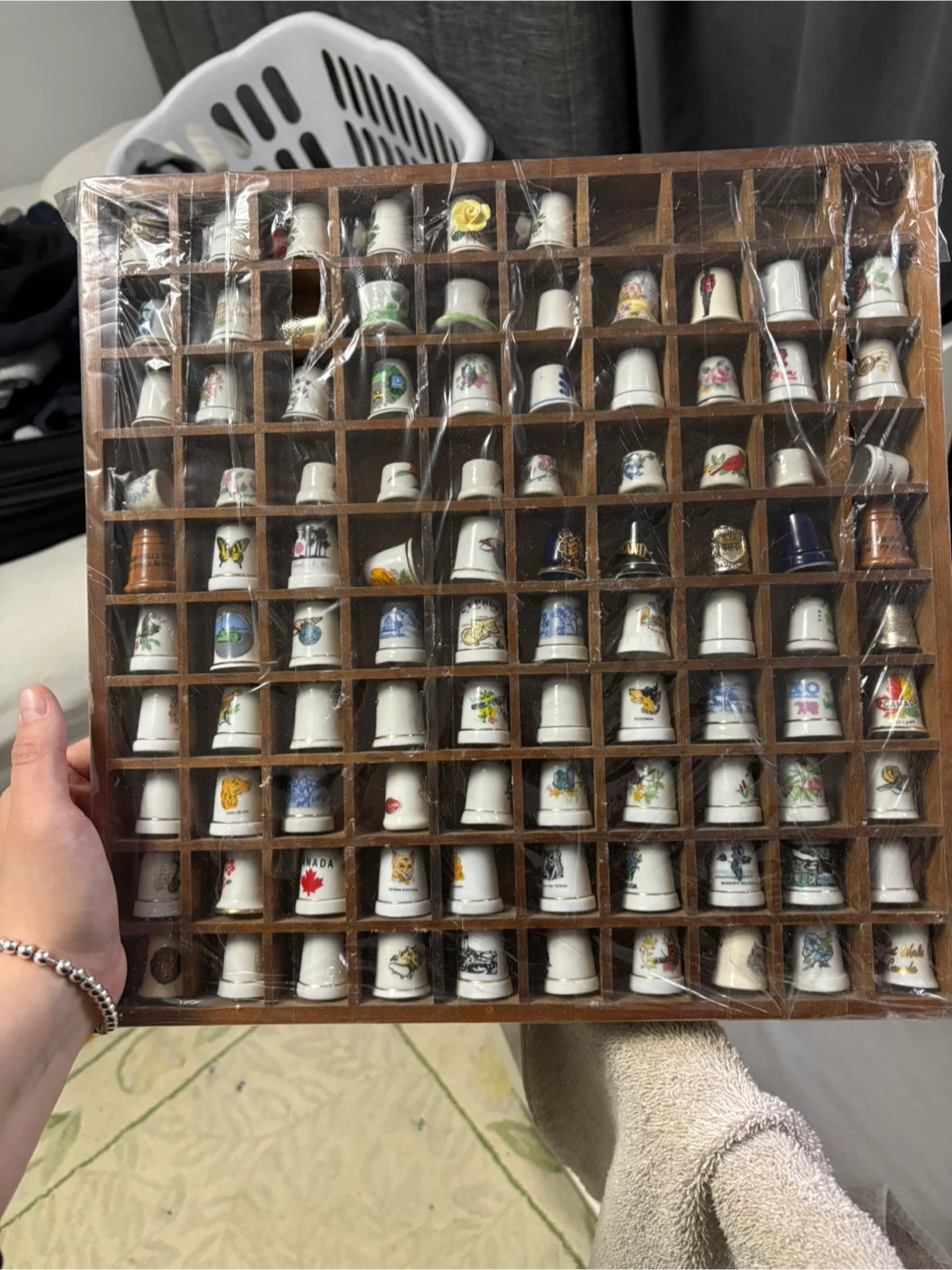 This collection features numerous decorative thimbles, each with unique designs and patterns. They are housed in a wooden display case with individual compartments. Many thimbles showcase Canadian imagery, like maple leaves. It's a lovely display piece!