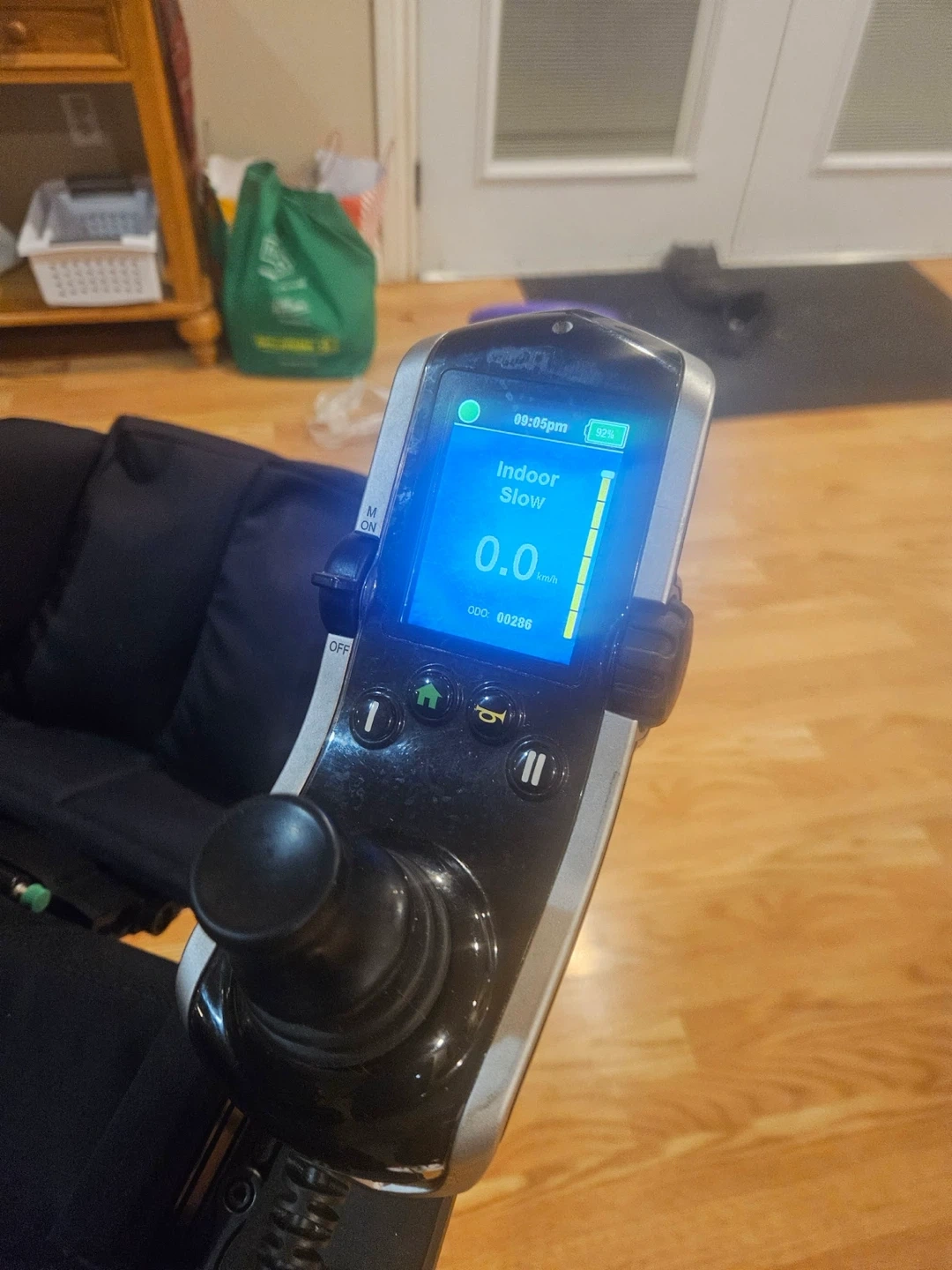 This is a Quantum Edge 3 power wheelchair. It features a comfortable black seat and adjustable armrests. The joystick control is easy to operate.