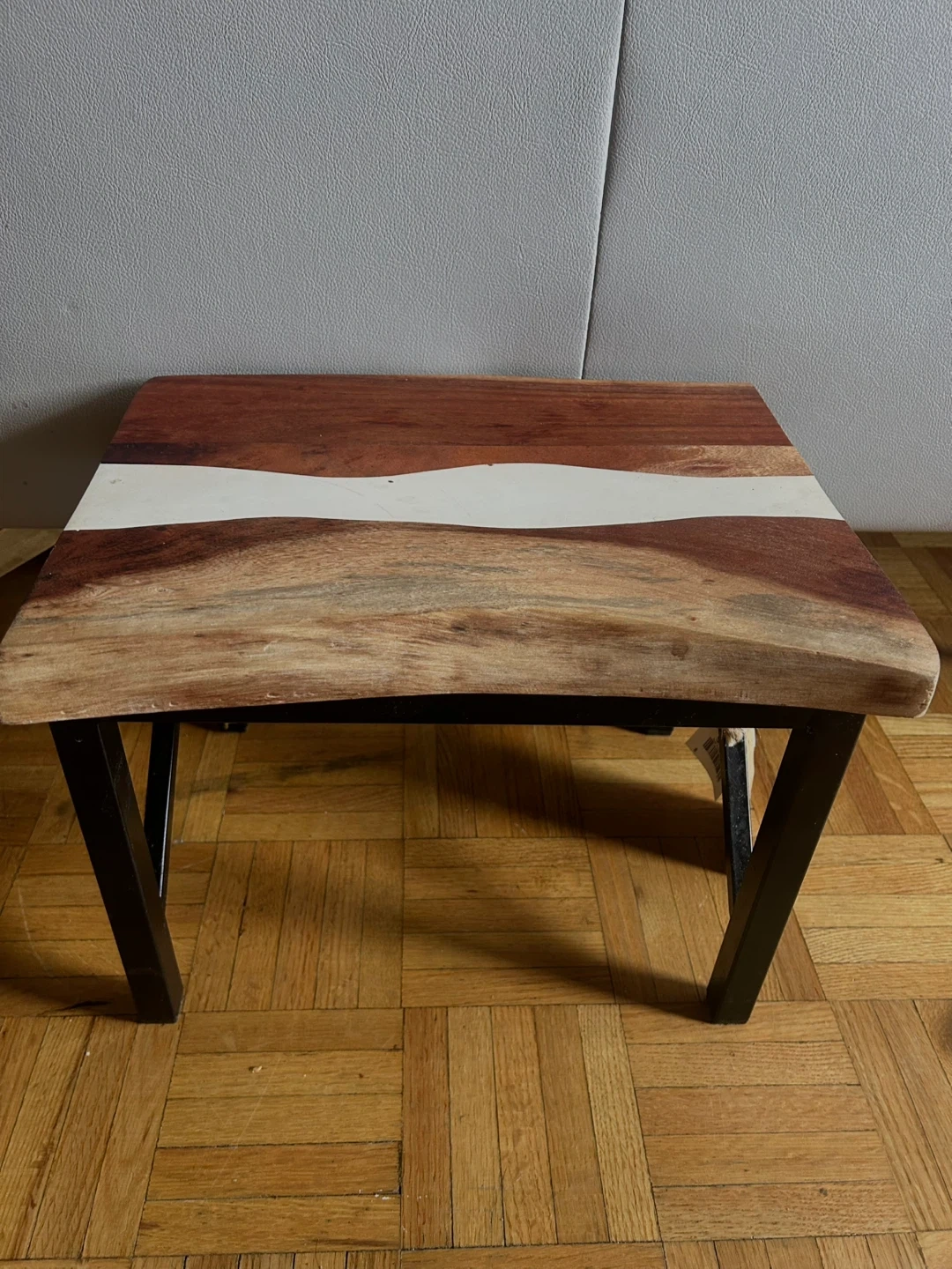 A unique accent kitchen stool with a live edge wooden top. The base is made of dark metal.