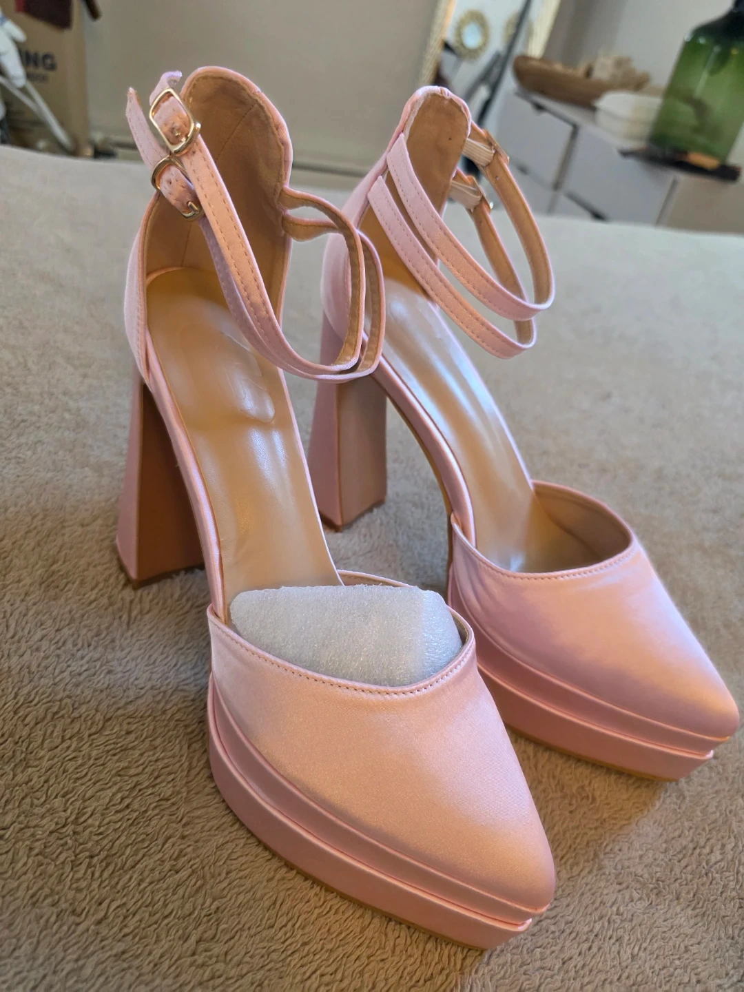 These stylish pink heels feature a chunky block heel and a platform sole. They have adjustable ankle straps for a secure fit. The satin-like material gives them a sleek finish.