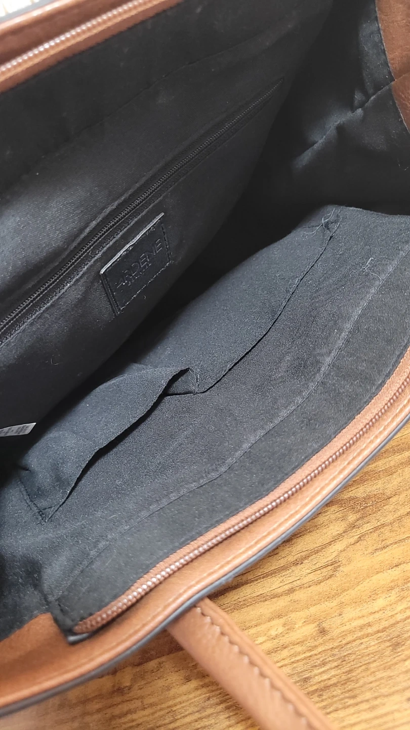 A stylish Ardene brown faux leather tote bag. It features a zip-top closure and a removable shoulder strap for versatility. Interior includes a zippered pocket and a slip pocket.
