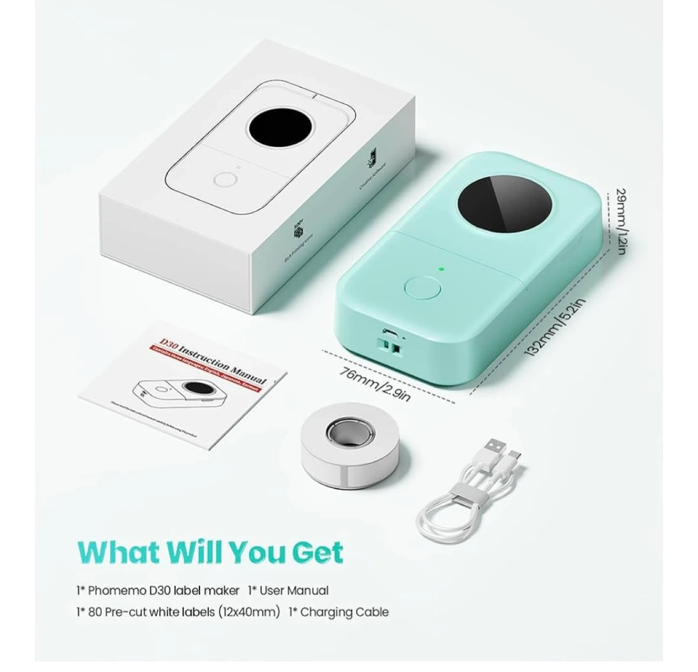 The Phomemo D30 Bluetooth label maker supports continuous and fixed-length label tapes. This compact machine is half the weight of traditional label makers, equipped with German thermal print head technology, providing superior clarity, hassle-free operation, smooth printing, and fast processing