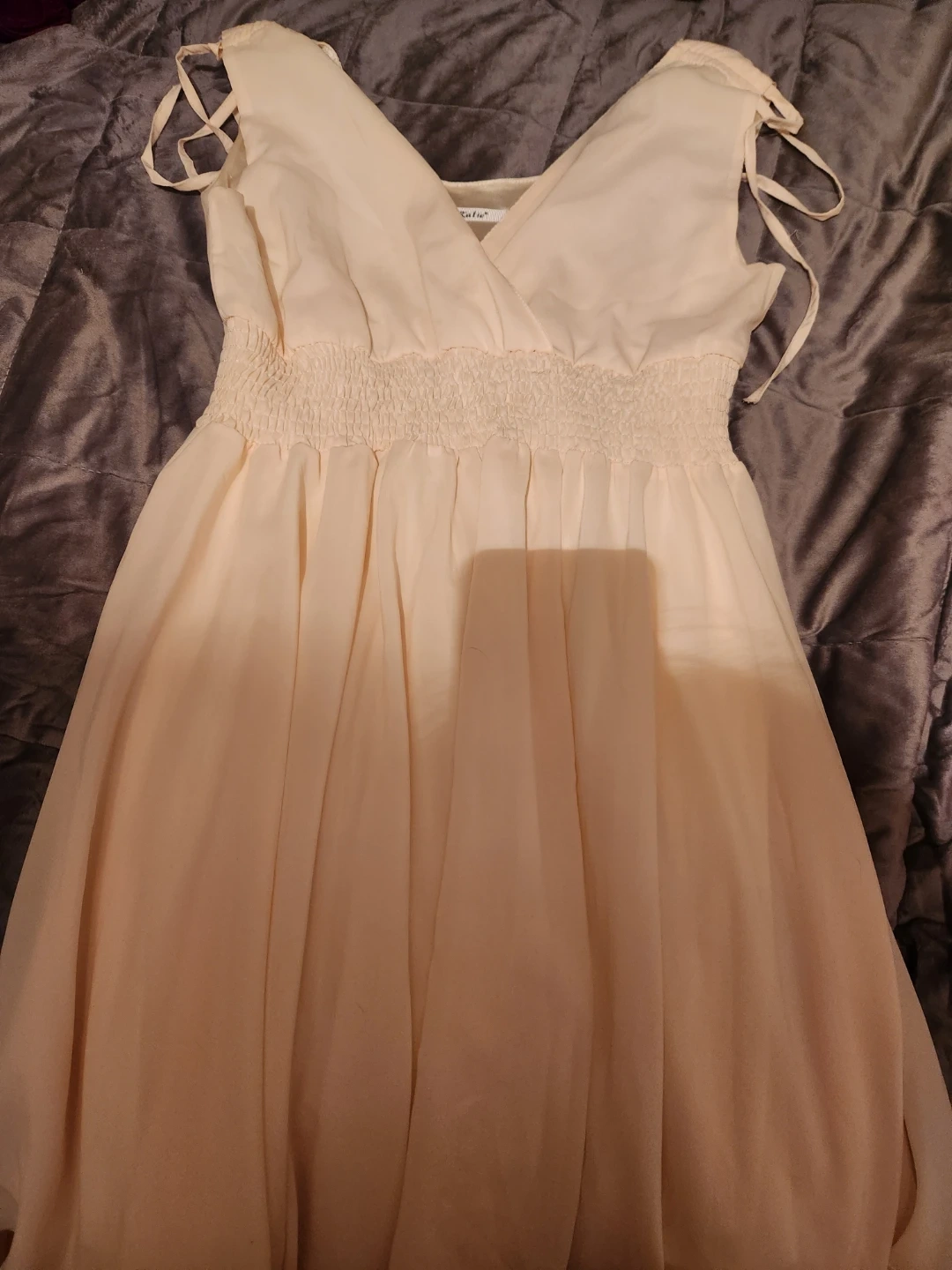 This Katie dress features a sleeveless, V-neckline with a smocked waist. It's made of a light, flowy chiffon material. The tie shoulder straps add a nice touch. If you interested chat with me and I'll give you the meeting spot/my address.