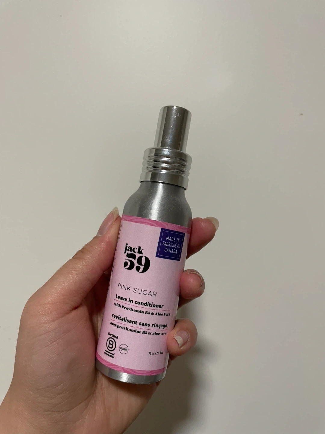 Selling a bottle of Jack 59 Pink Sugar Leave-In Conditioner! It contains ProVitamin B5 and Aloe Vera to help revitalize your hair. The bottle contains 75 mL / 2.5 fl oz of product. Made in Canada!