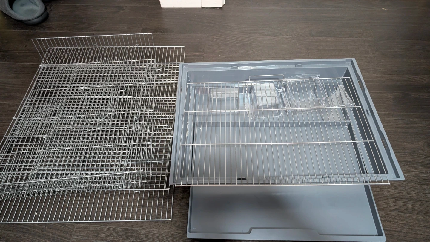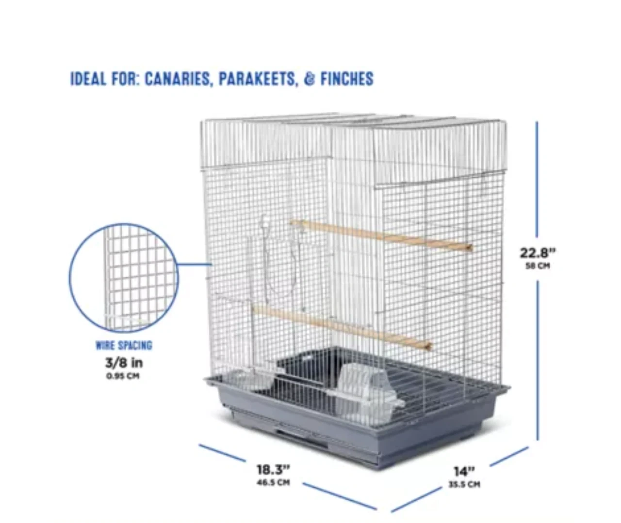This bird cage is ideal for canaries, parakeets, and finches. It features 3/8 inch wire spacing. Includes two perches and a pull-out tray for easy cleaning.