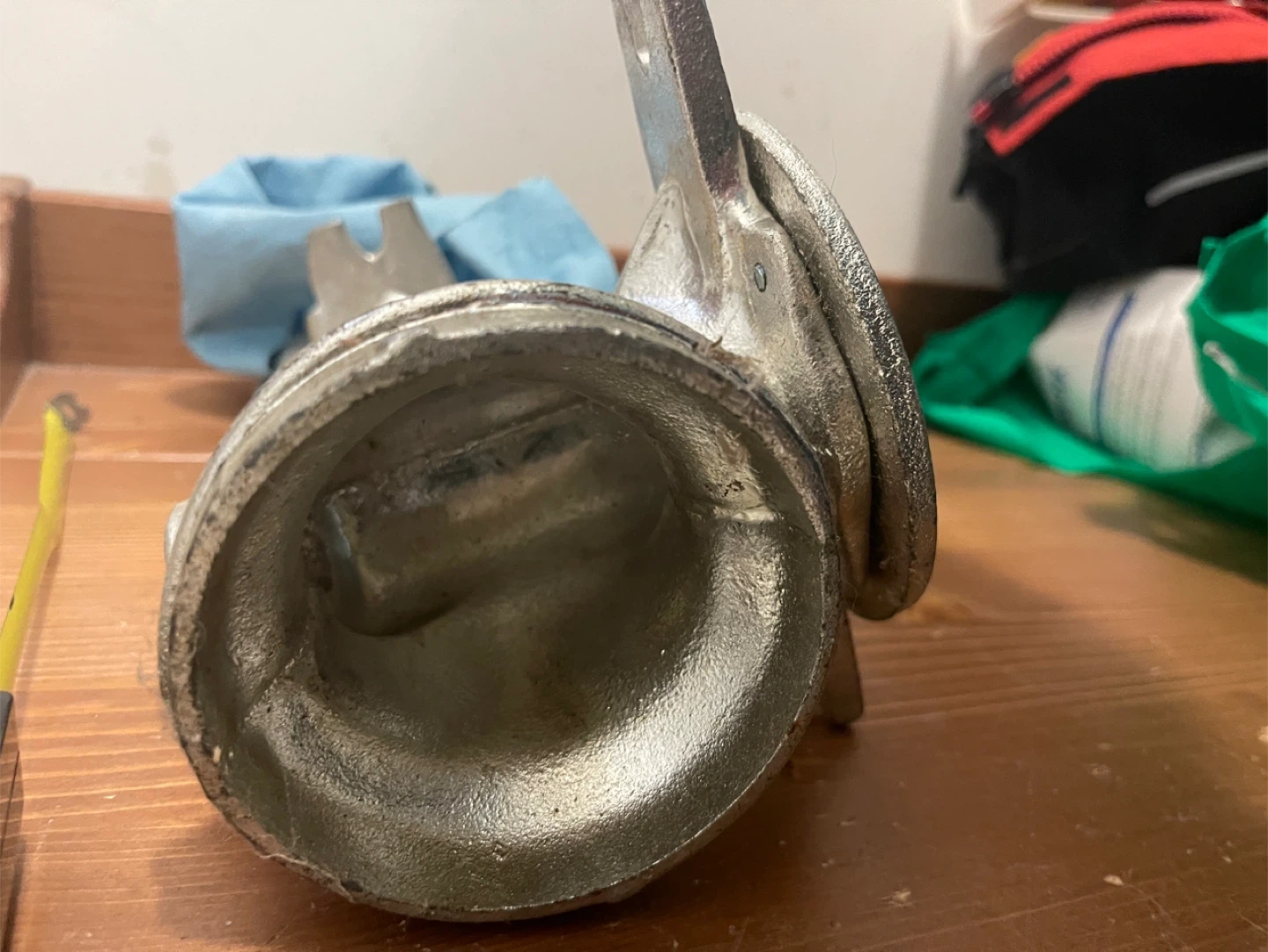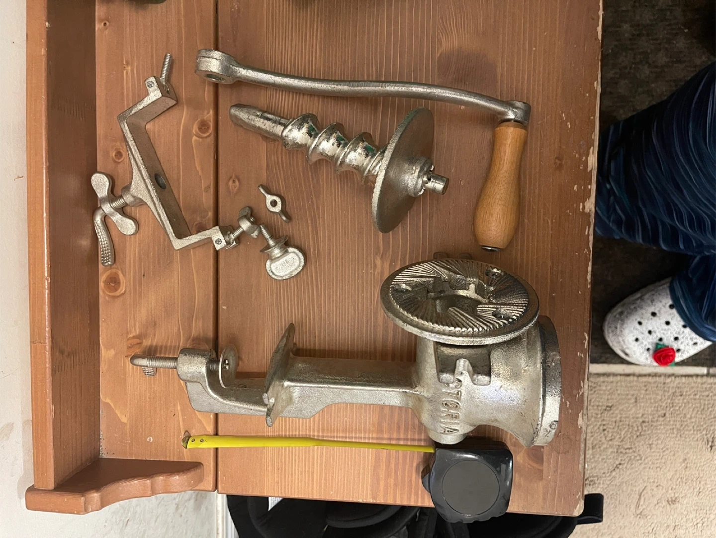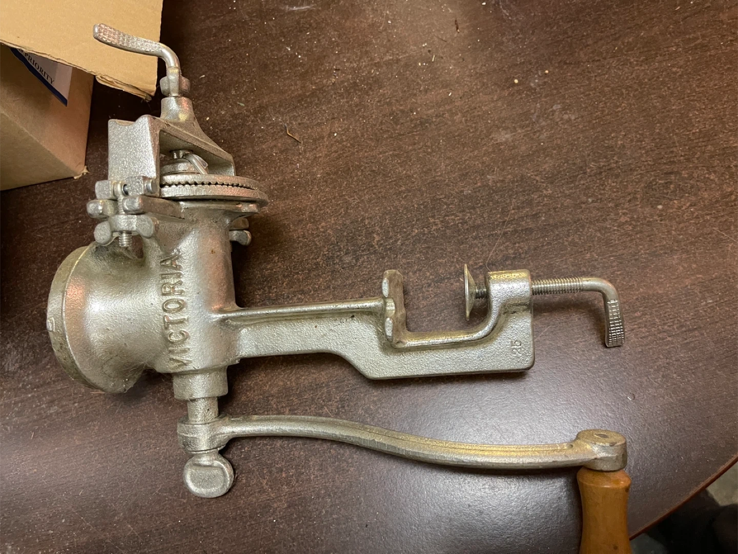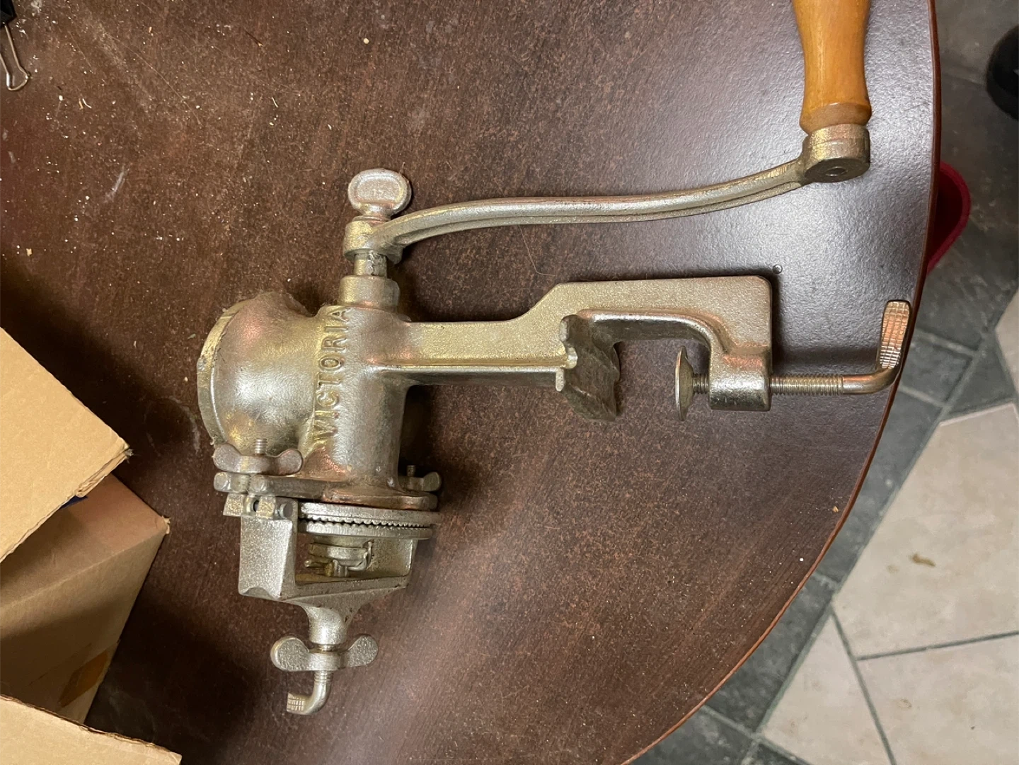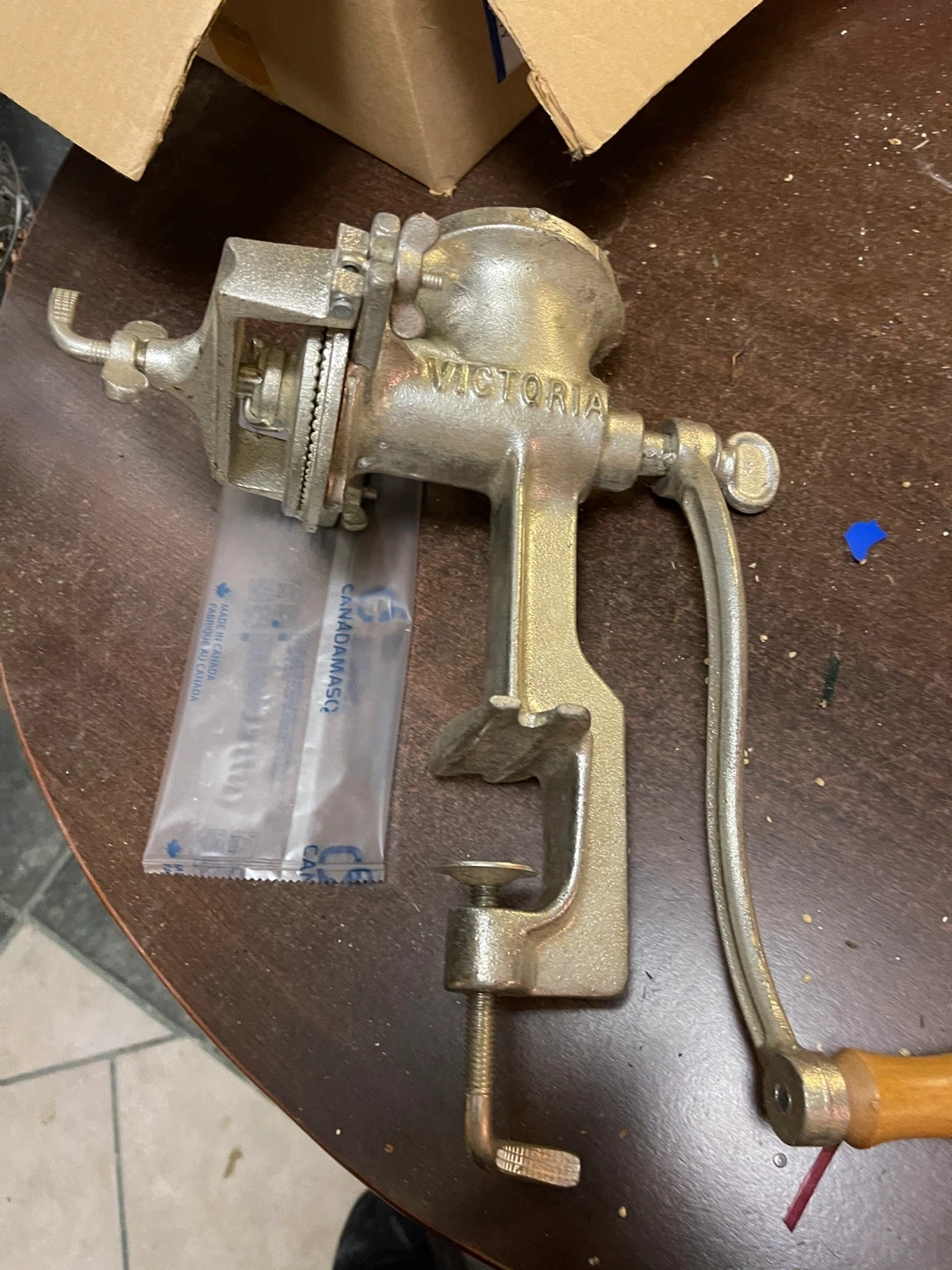 This is a vintage Victoria meat grinder with a hand crank. It's made of metal and includes a clamp to attach to a table. Great for grinding meat or making pasta!