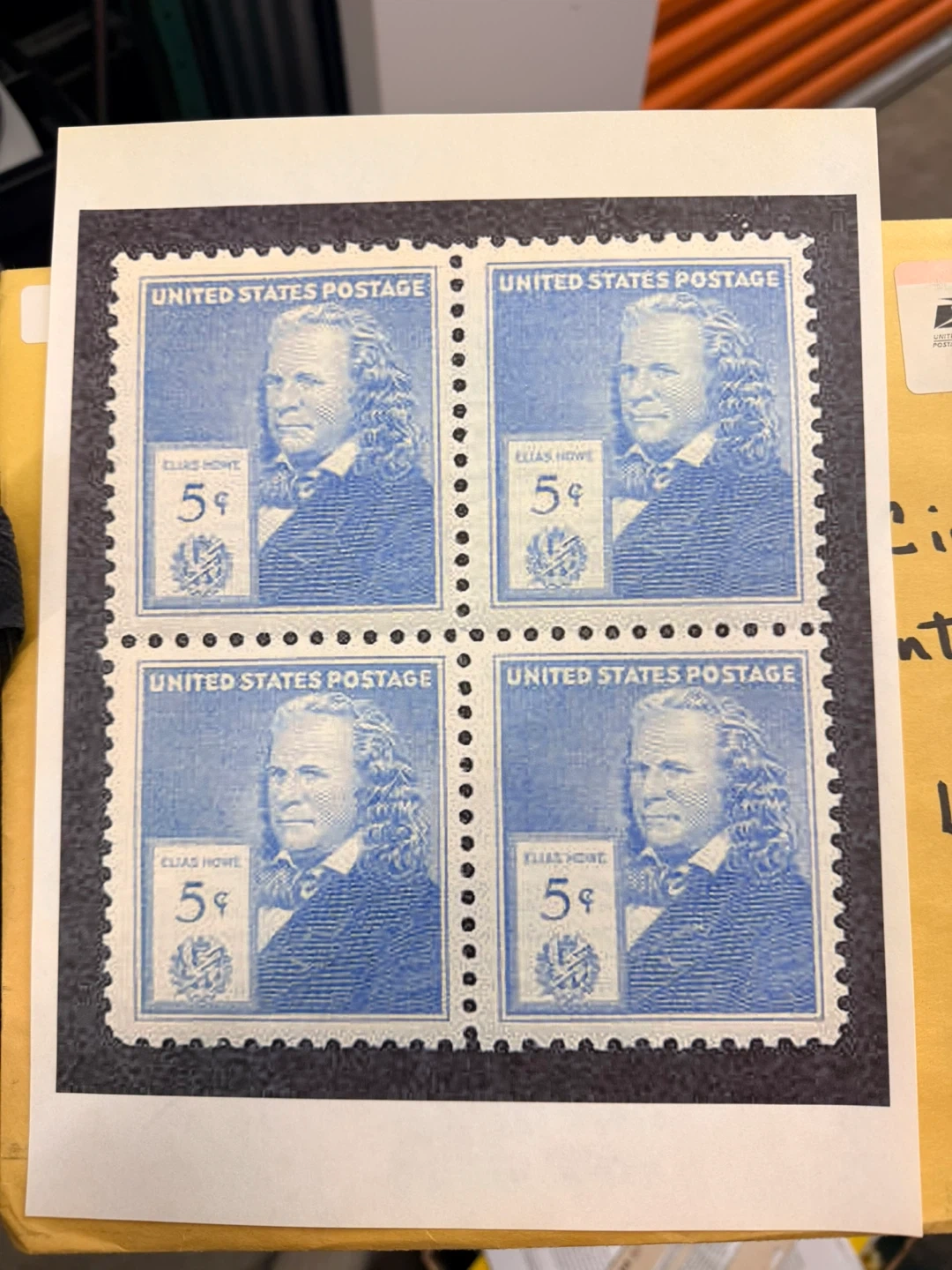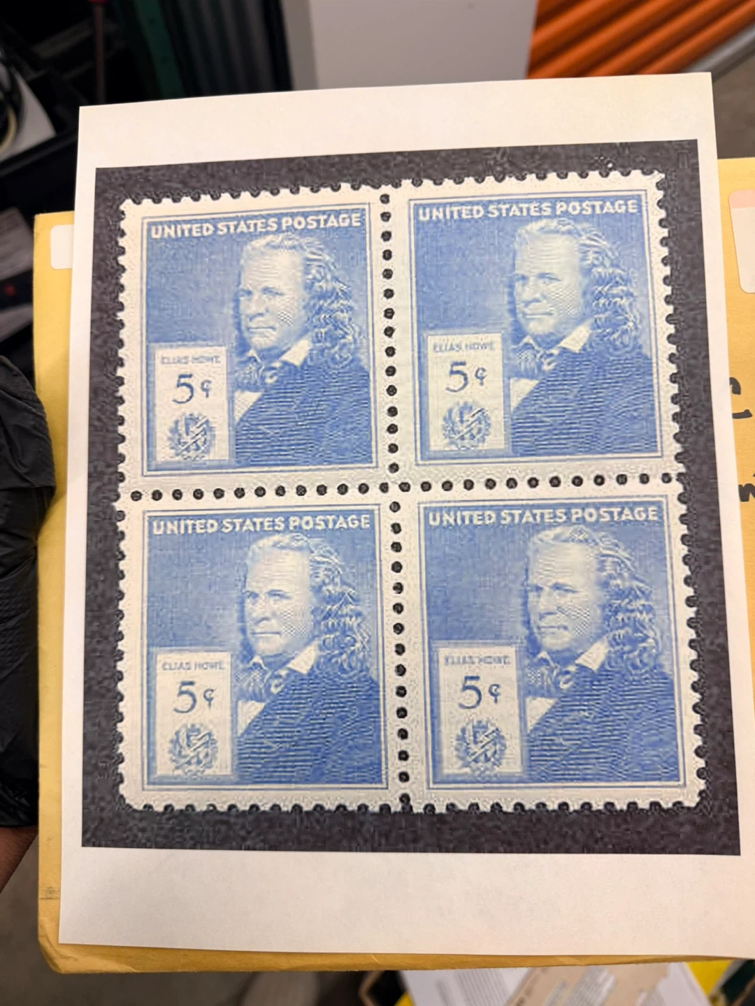 Sheet of four 5 cent United States Postage stamps featuring Elias Howe. Printed in blue ink.
