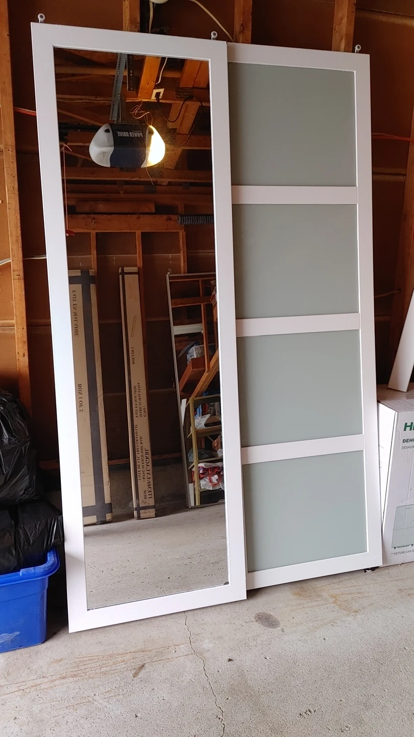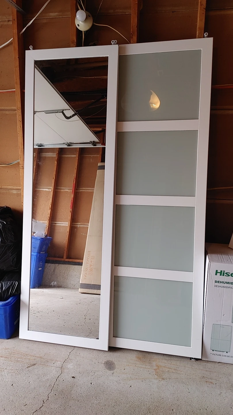 4 sets profess. spray painted - CAVEAT - 3 of 4 sets must be scored with blade (mirrored area). 5th set is 2 fully mirrored doors in slim pewter frame. All have rails and valances. (48 inch wide x 80 high - with variance of 80-81.5 inches high on assembly) *** FREE *** First come first serve. Pick up at Bathurst and Steeles area.