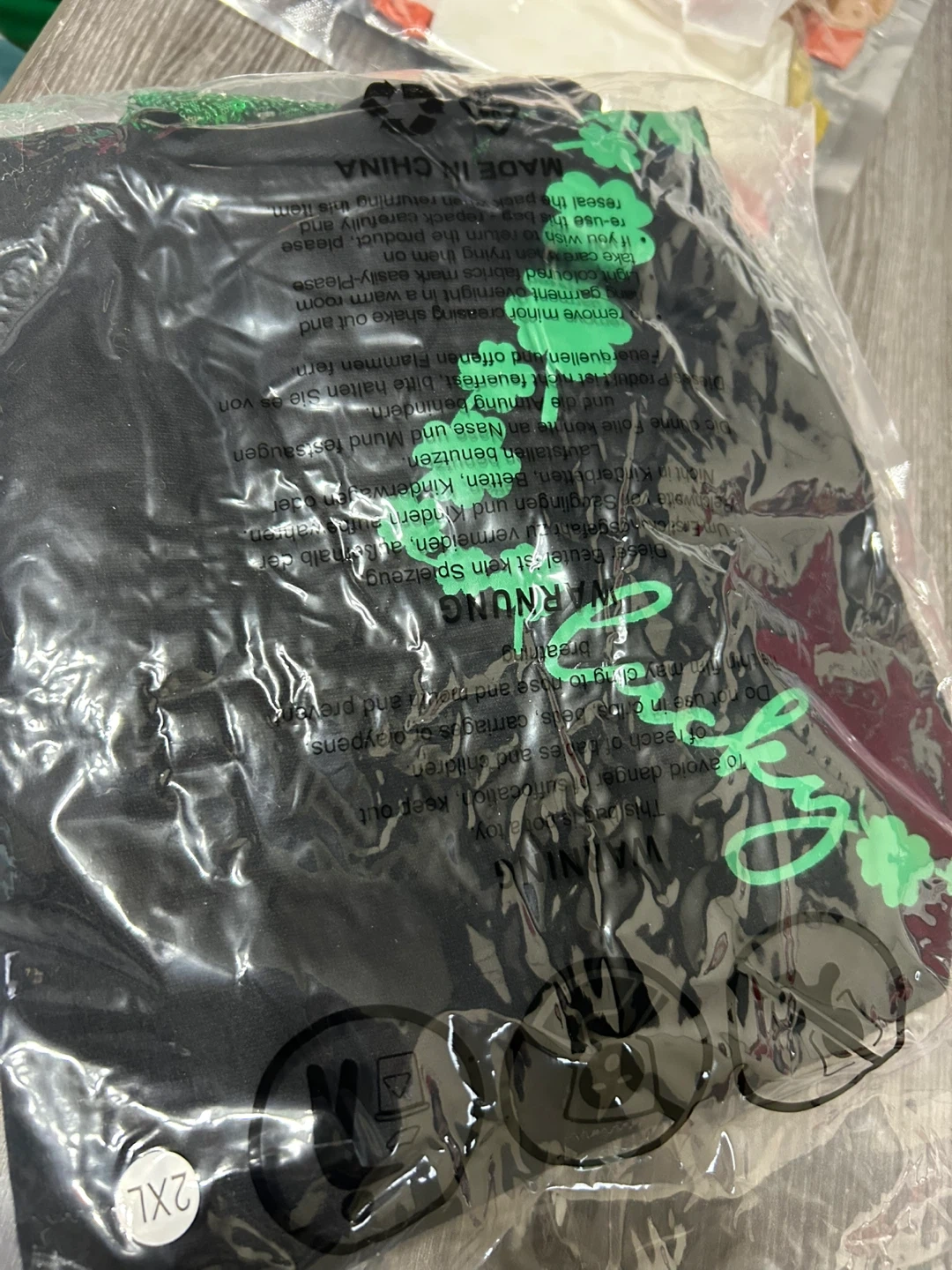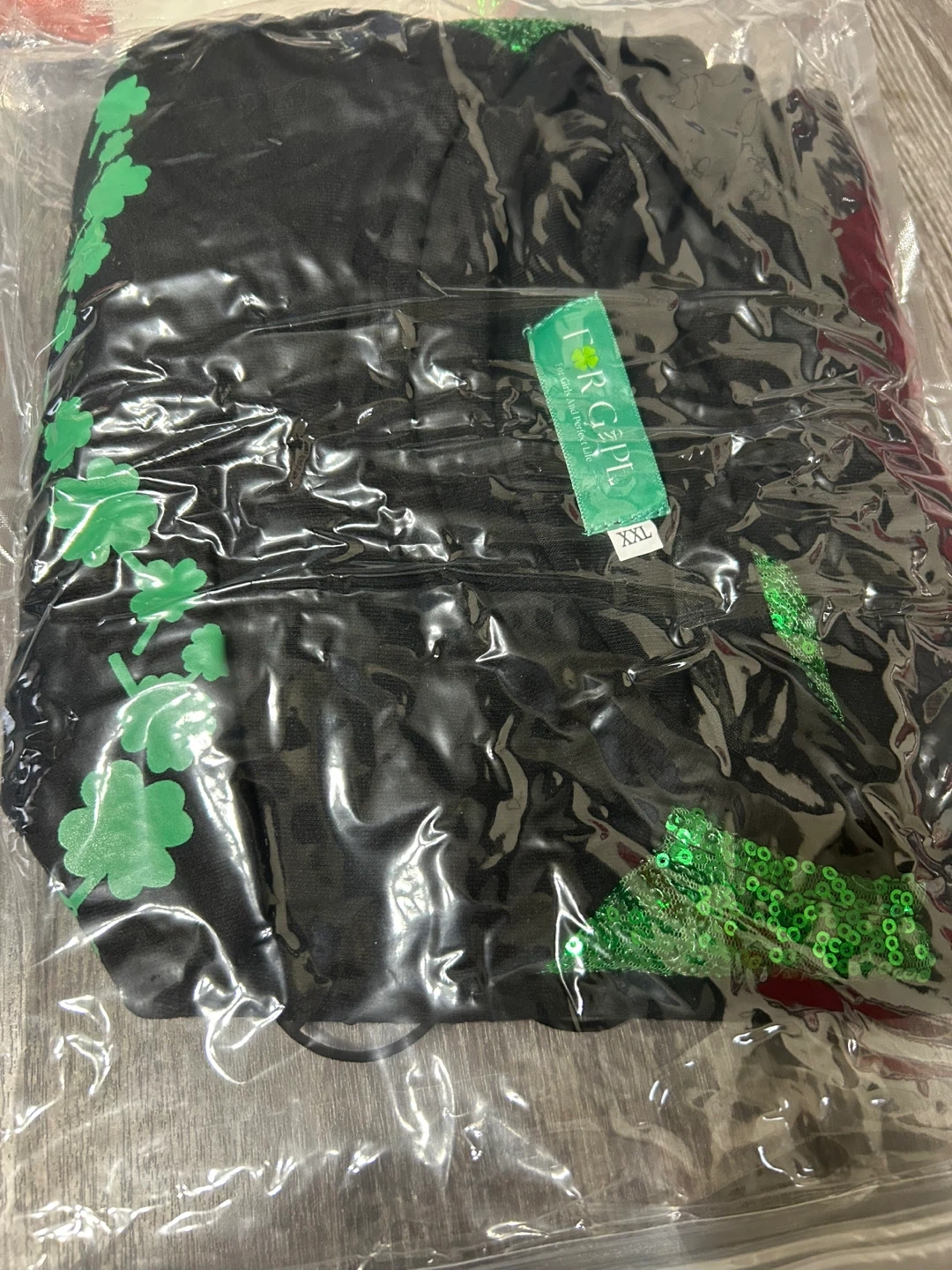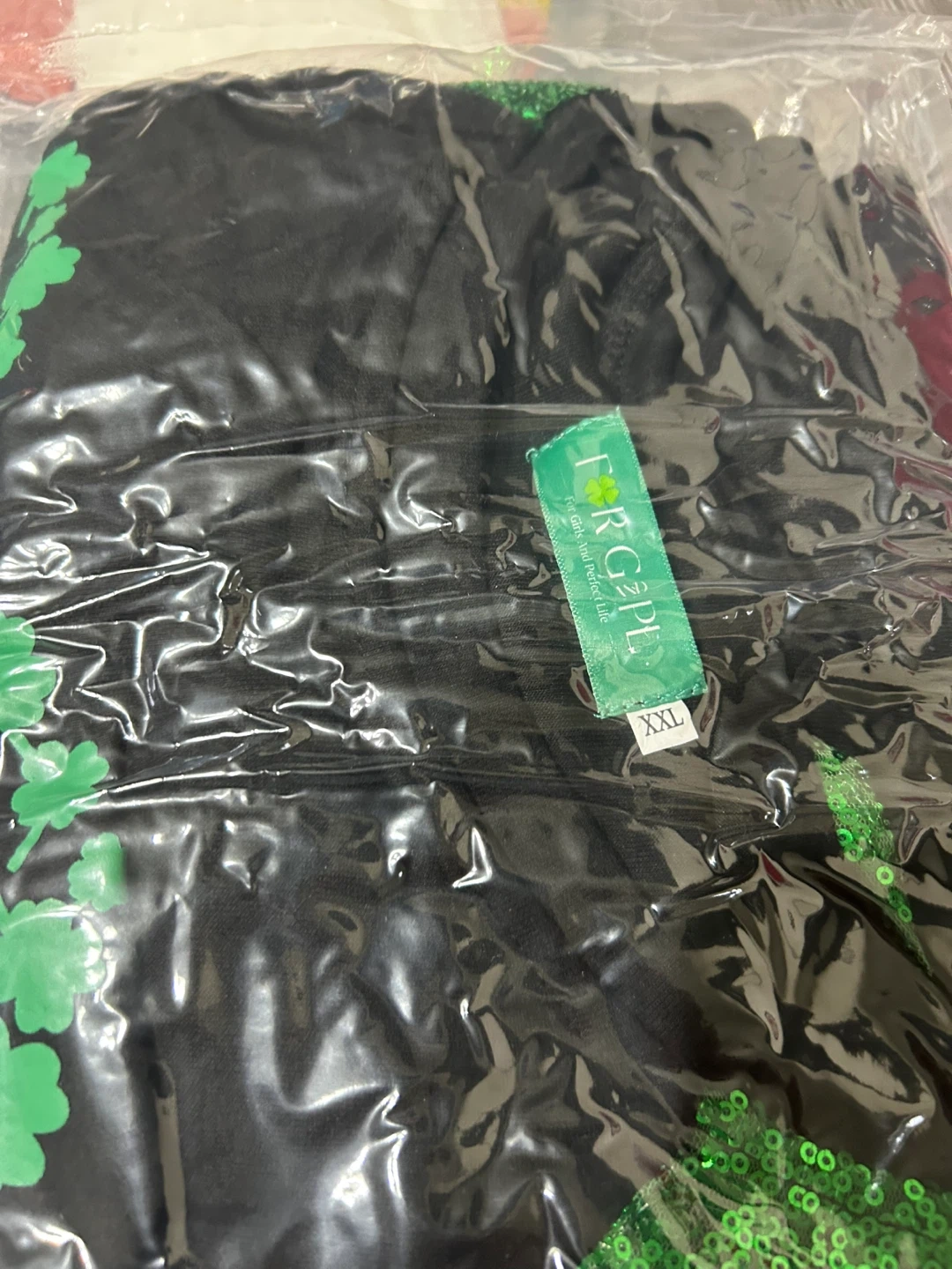 This new FRGEPF shirt features a black body with green shamrock and sequin details forming a lucky heart design. It's a size XXL with sequined sleeves. Perfect for St. Patrick's Day celebrations! Pick up at Islington /401 / bergamot avenue Etobicoke.
