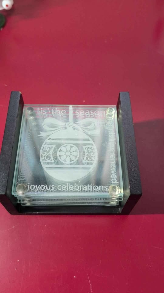 Selling a set of six holiday themed coasters with wooden holder. Each one is etched with holiday themed messages. No scratches, no nicks on the coasters.