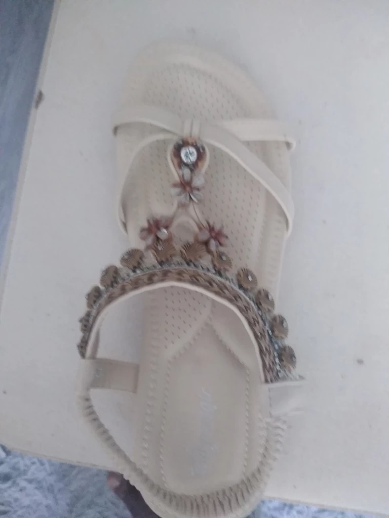 Women's beige sandals. Features decorative embellishments around the ankle strap. Lightweight and comfortable. Open toe and ankle strap design.