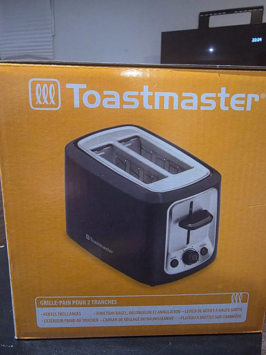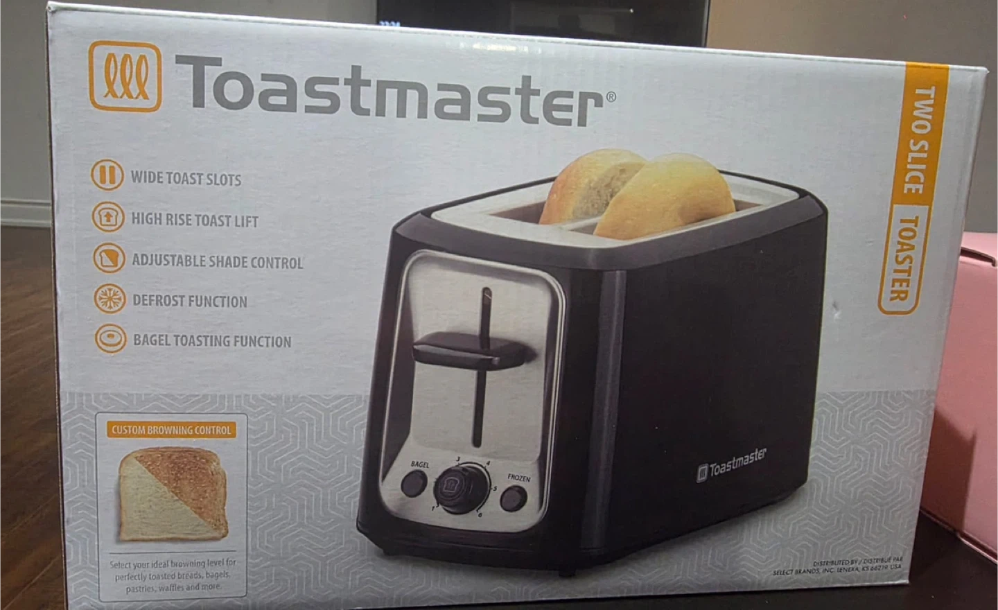 This Toastmaster two-slice toaster features wide slots for various bread types. It has a high-rise toast lift, adjustable shade control, defrost, and bagel toasting functions. A crumb tray makes cleanup a breeze!