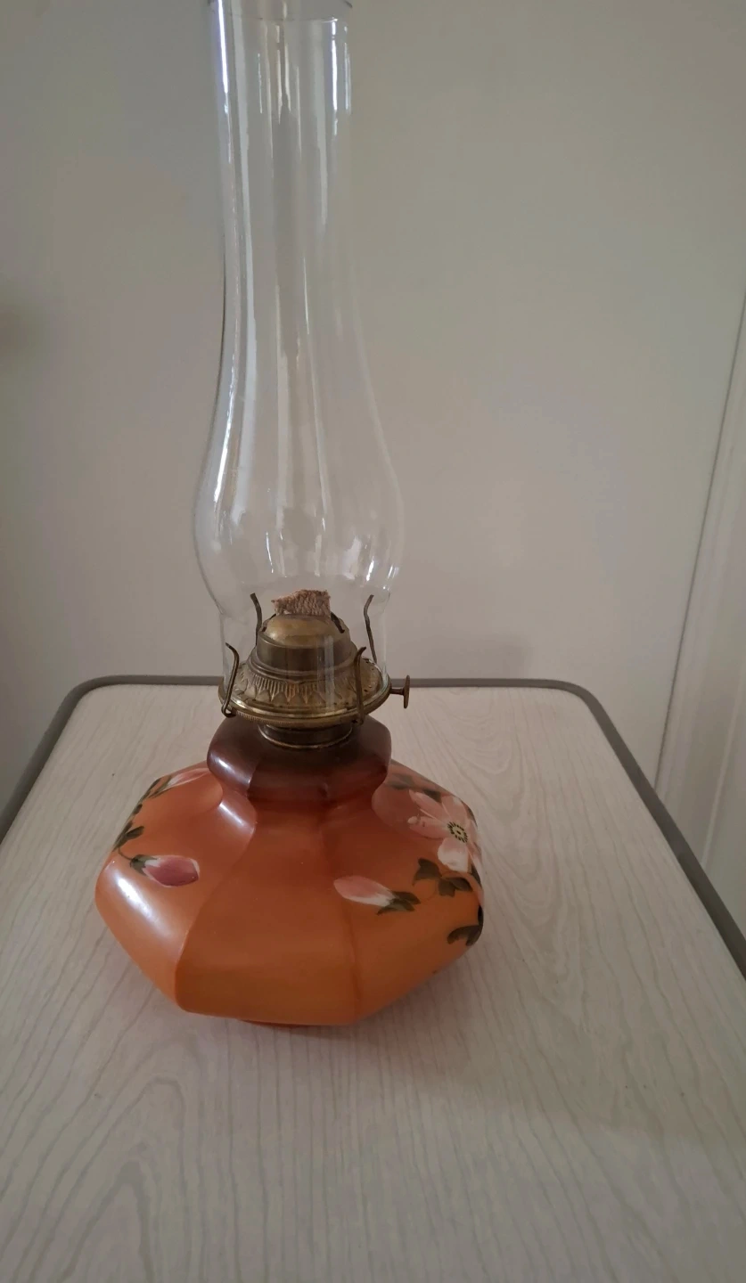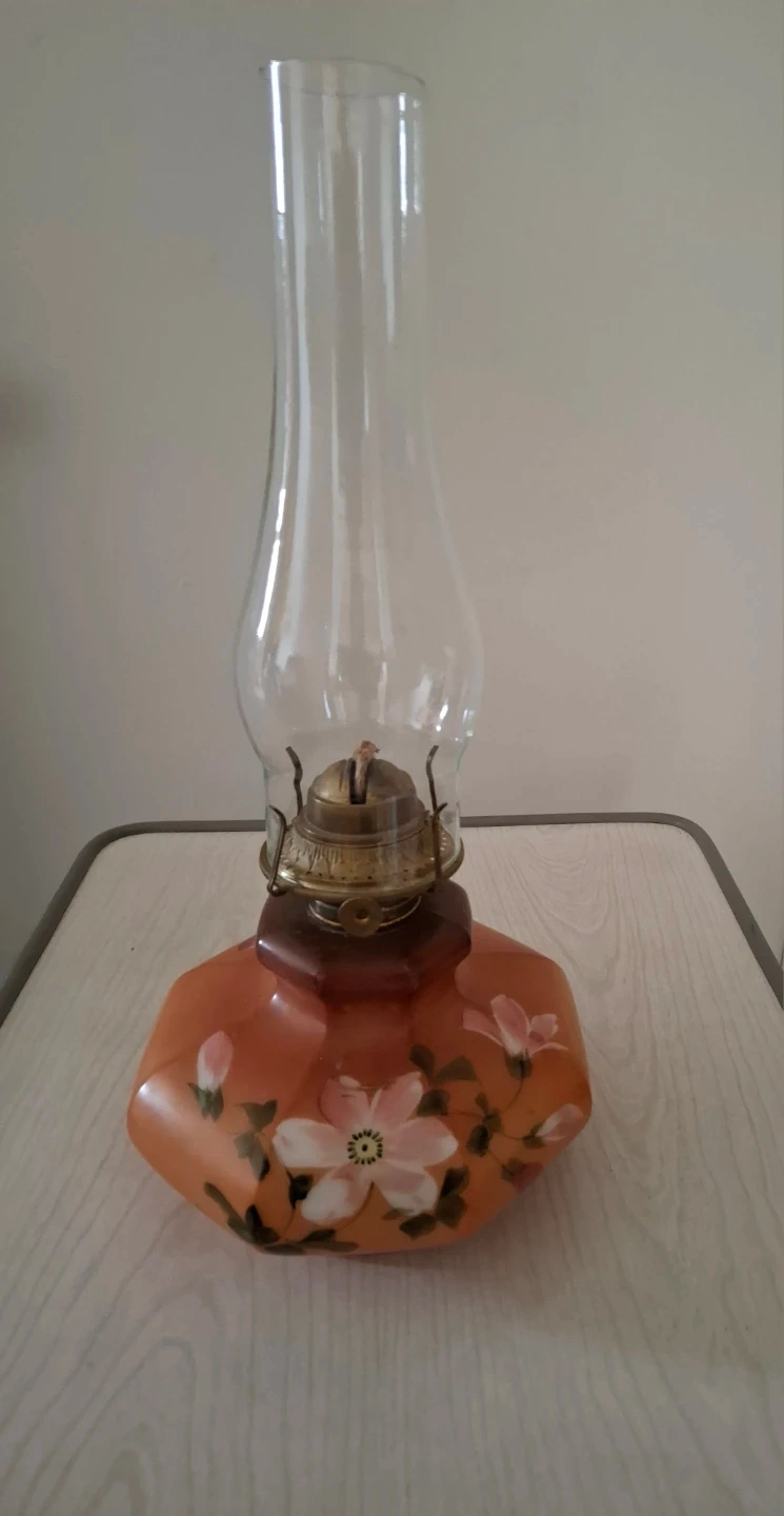 This vintage oil lamp has a hexagonal amber glass base with hand-painted floral details. It features a brass burner with a wick. This lamp would add a classic touch to any room.