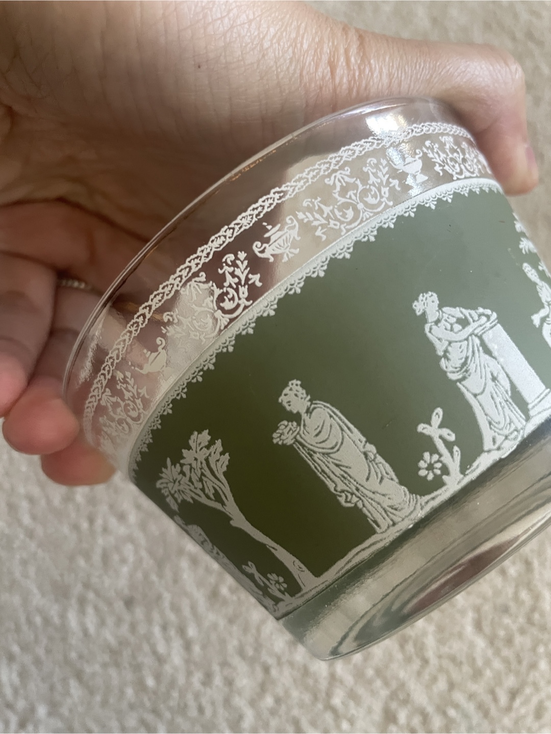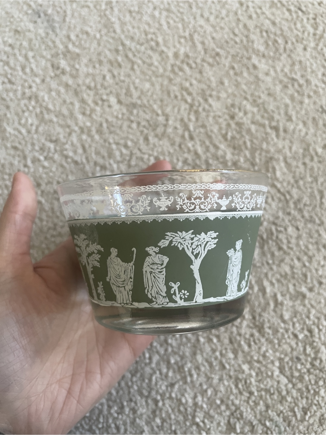 This is a pretty vintage glass bowl with a green band featuring white Grecian-style silhouettes. It's a lovely piece for display or serving. The rim has a delicate white pattern.