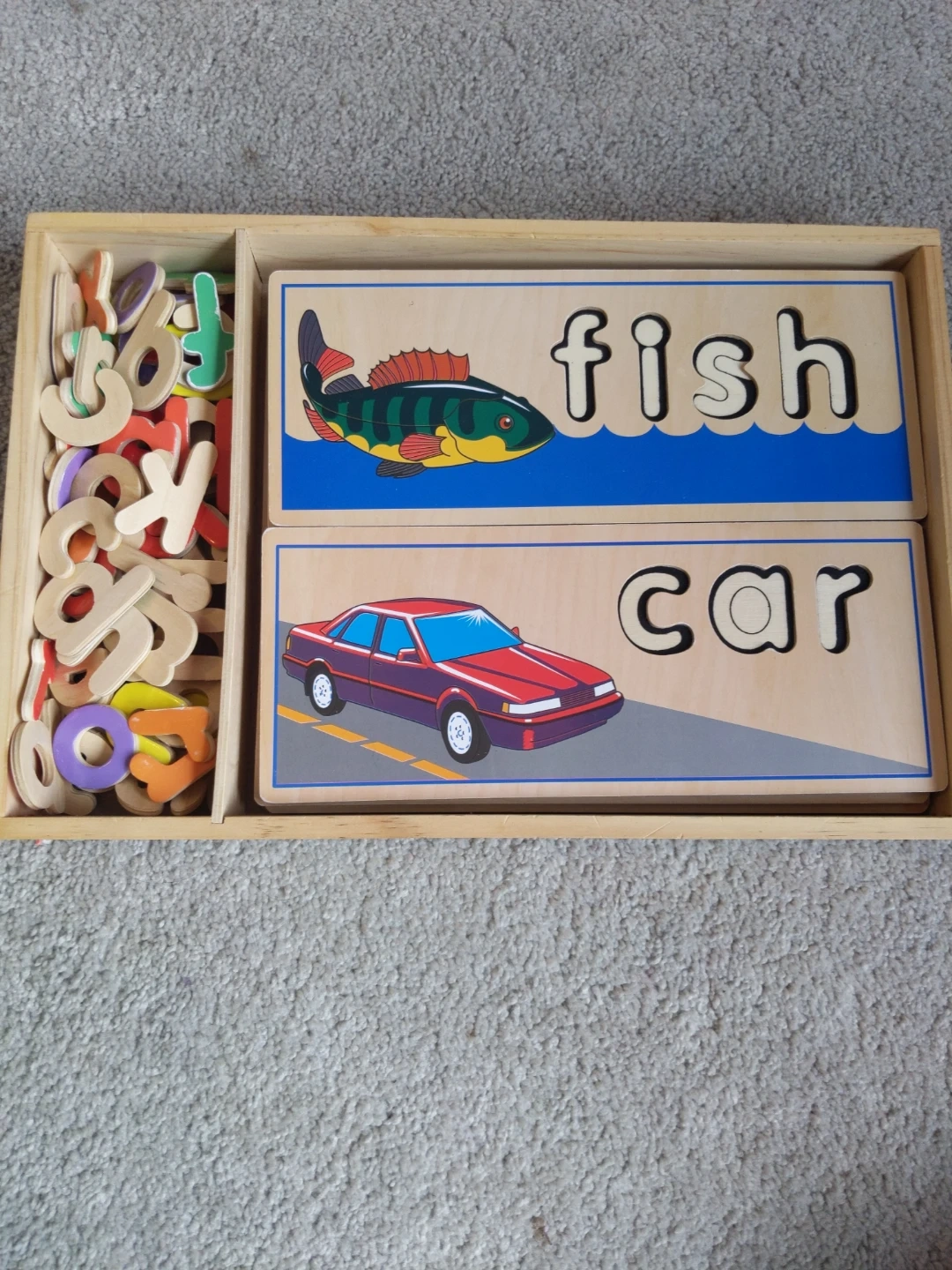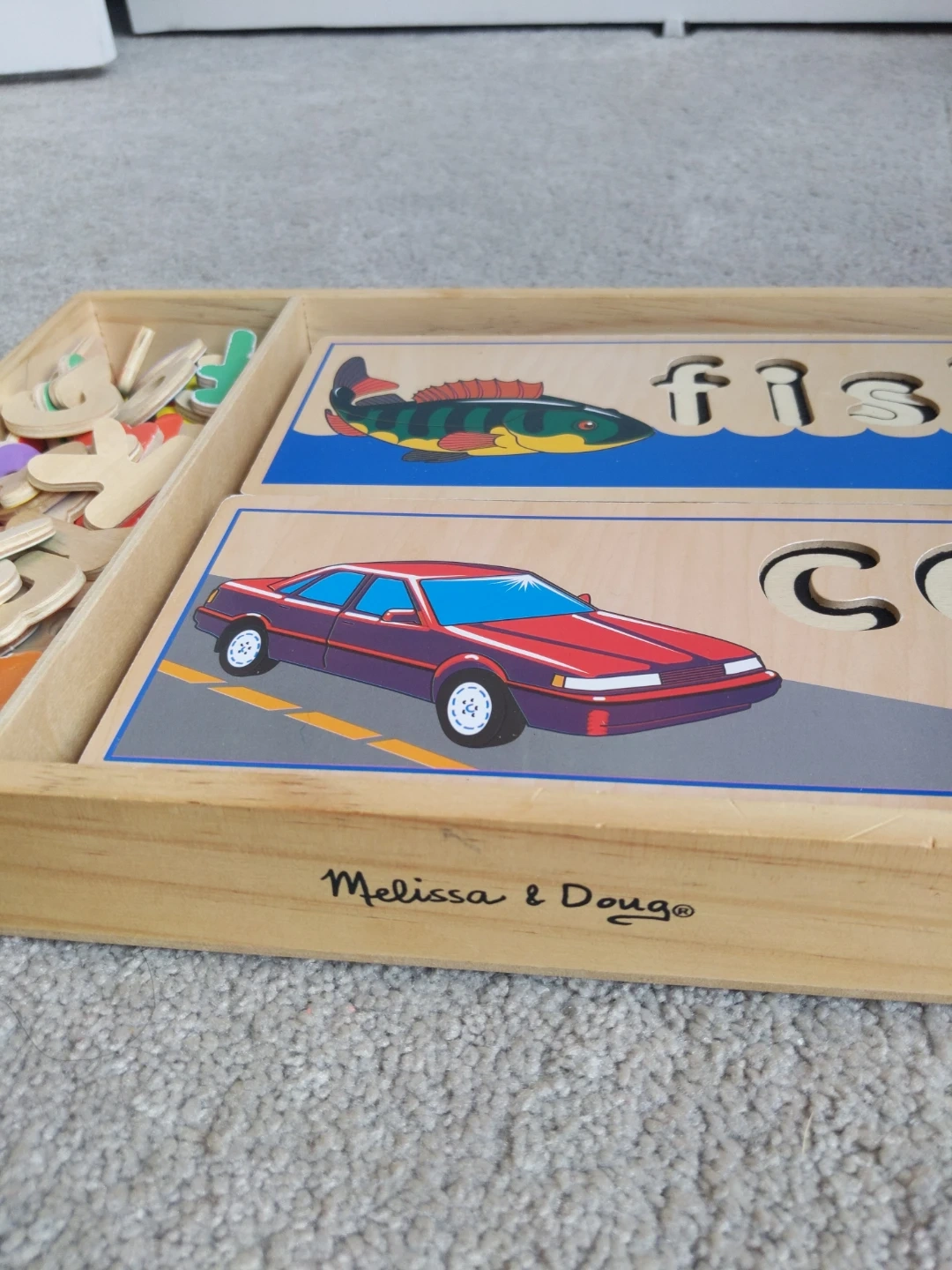 This Melissa & Doug wooden puzzle features chunky pieces for little hands. It includes boards for 'fish' and 'car' and other short words with matching wooden letters and images. Great for early learning and fine motor skills!