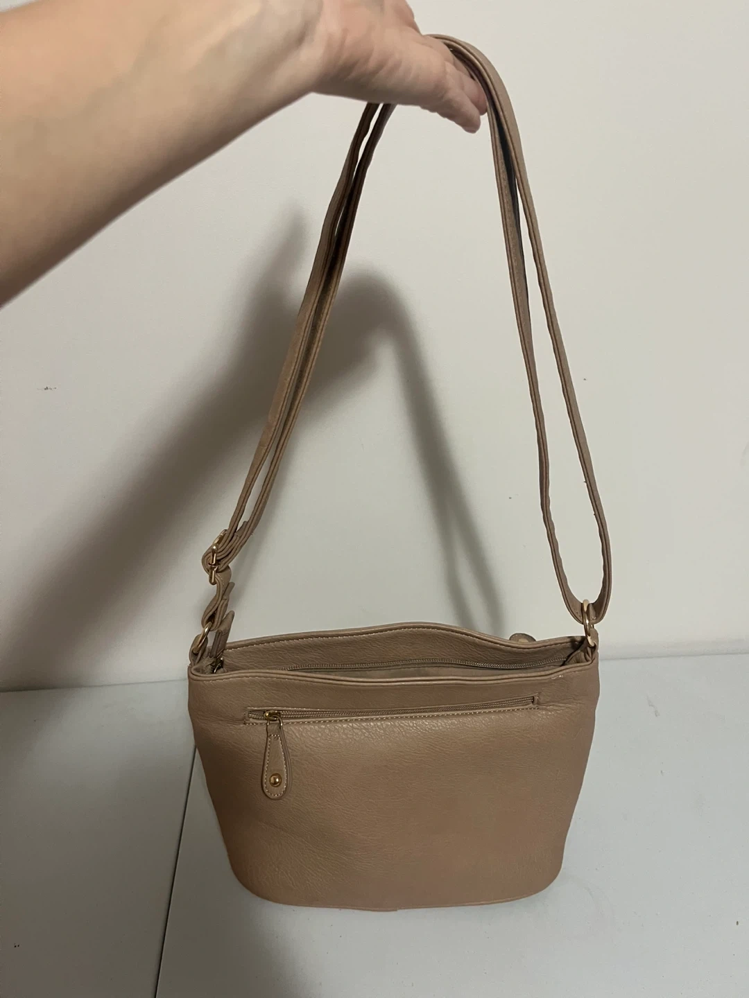 Barely used .. This light brown shoulder bag has multiple zippered compartments. It's made of a faux leather material. It's a great size for everyday use!
