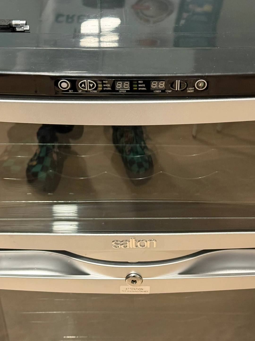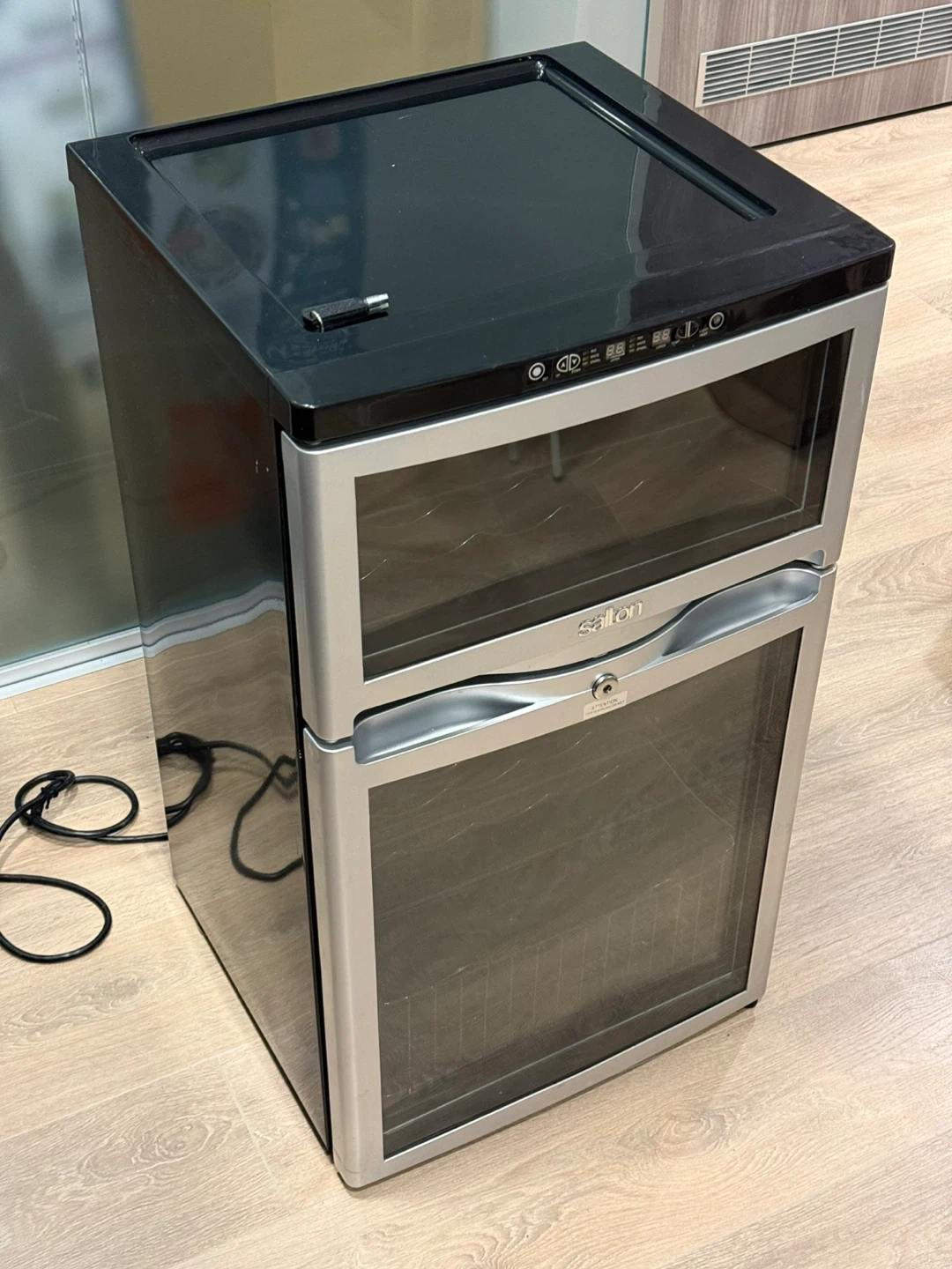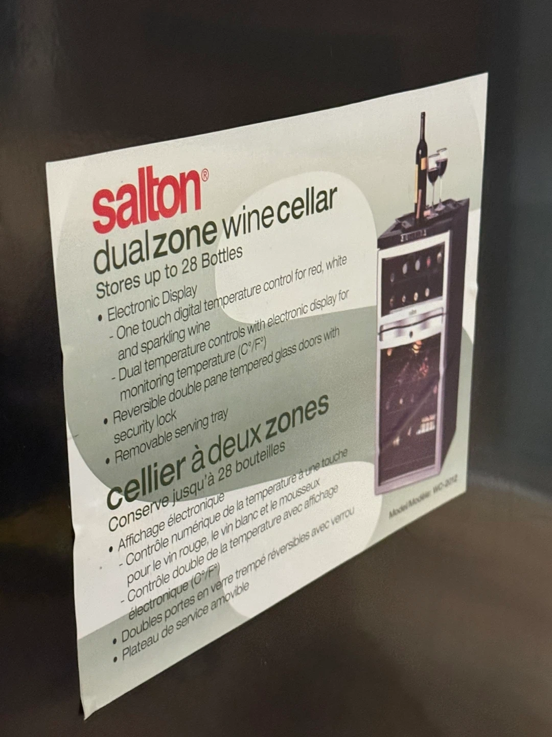 This Salton dual zone wine cellar stores up to 28 bottles. It features an electronic display with one-touch digital temperature control for red, white, and sparkling wine. The unit has dual temperature controls (C°/F°) and reversible double pane tempered glass doors with a security lock. It also includes a removable serving tray.