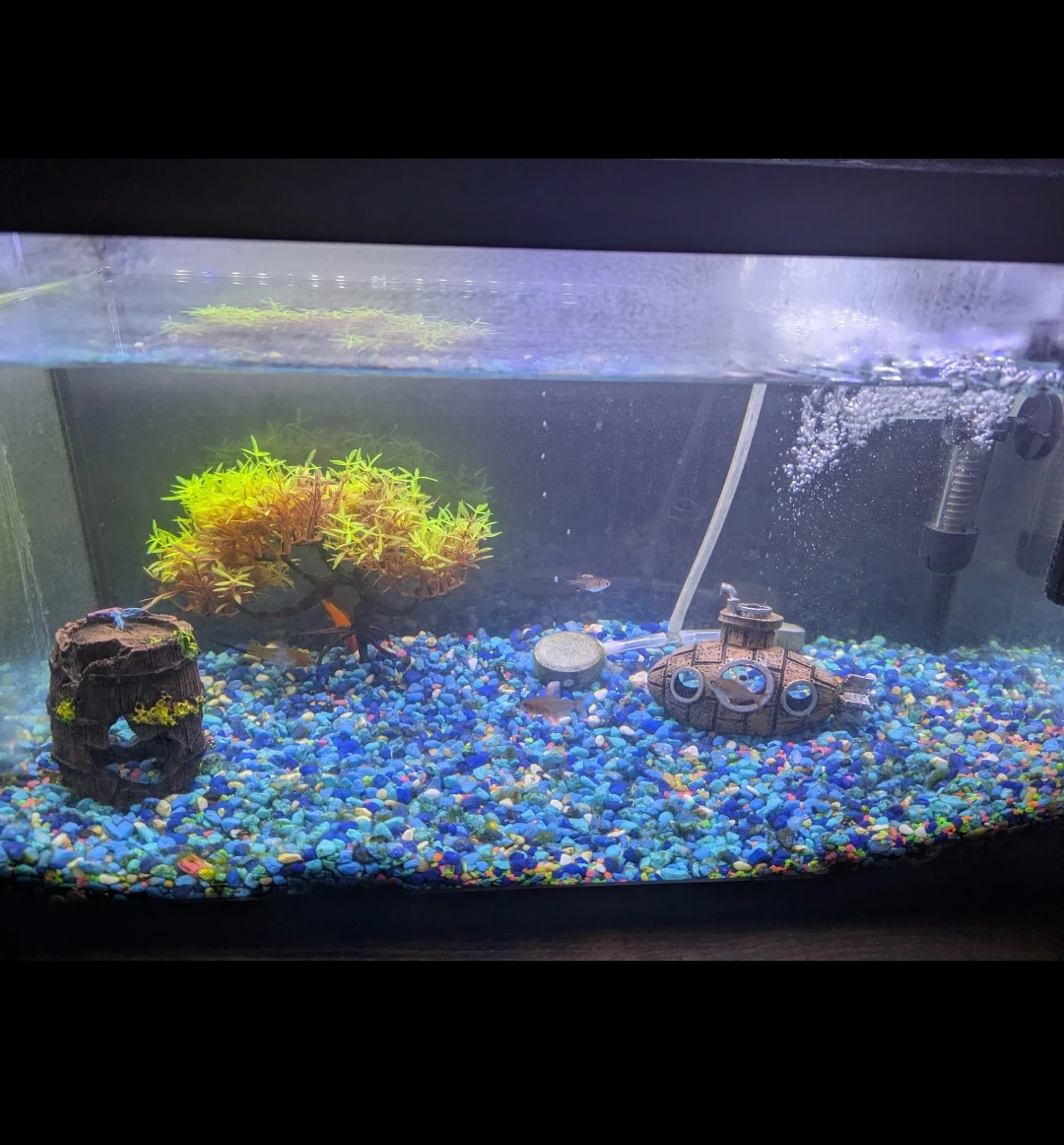 20Selling an aquarium setup that includes gravel, a decorative barrel, a decorative submarine, and a plastic plant. Fish food Aquarium 29 gal 2 fish Light Filter Water heater Aquarium air pump with air stone Conditioner Gravel and aquarium Aquarium decorations contact serious buyers only......