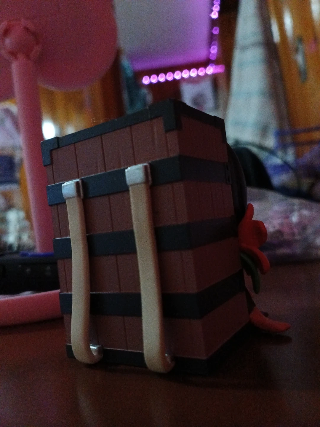 This is a cute chibi figure of Nezuko Kamado from Demon Slayer. It's made of plastic and features her iconic bamboo muzzle and pink bow. Great for any Demon Slayer fan!