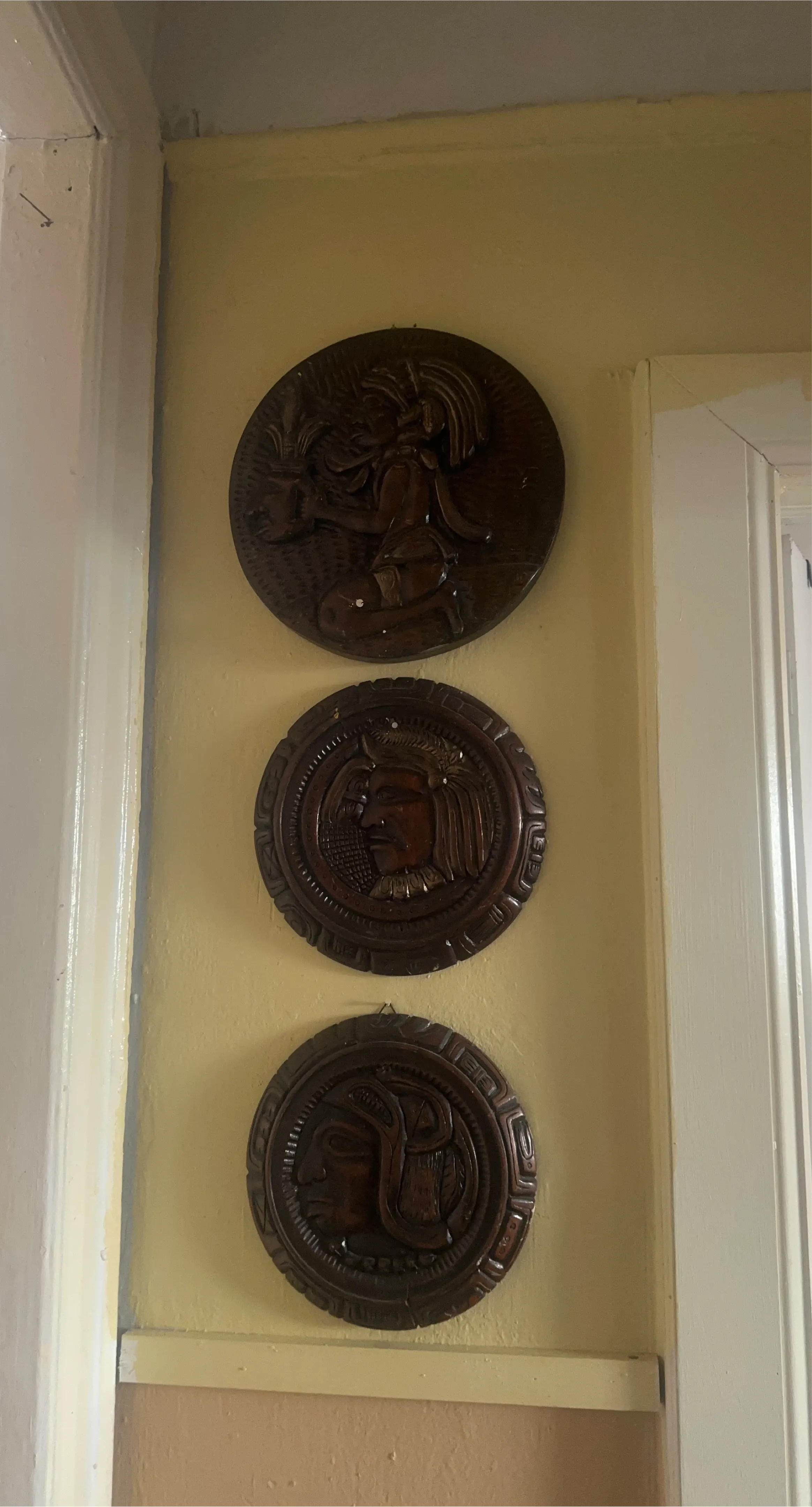 Displaying a collection of three intricately carved wooden plaques. Each plaque features a unique circular design with detailed depictions. These are handcrafted pieces, perfect for adding a rustic or ethnic touch to your home decor. They're made from solid wood.