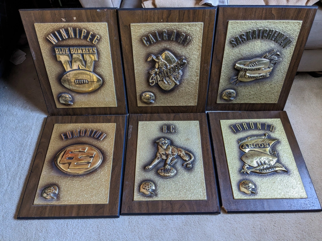 Buy & SellVintage Canadian Football League Team Plaques (Set of 6)Vintage Canadian Football League Team Plaques (Set of 6)$130Six vintage plaques, each featuring a different CFL team logo. Wooden frames. Gold-toned embossed designs. Collectible memorabilia. Great for fans.WHERE TO MEETOrléansView MapSELLERverifiedalexOrléans650 reviews0 chats·0 favorites·6 viewsSEND CHAT TO SELLERHi alex! I’m interested in your listing.Hi alex! I’m interested in your listing.Get the Karrot app to chatSign In to chat