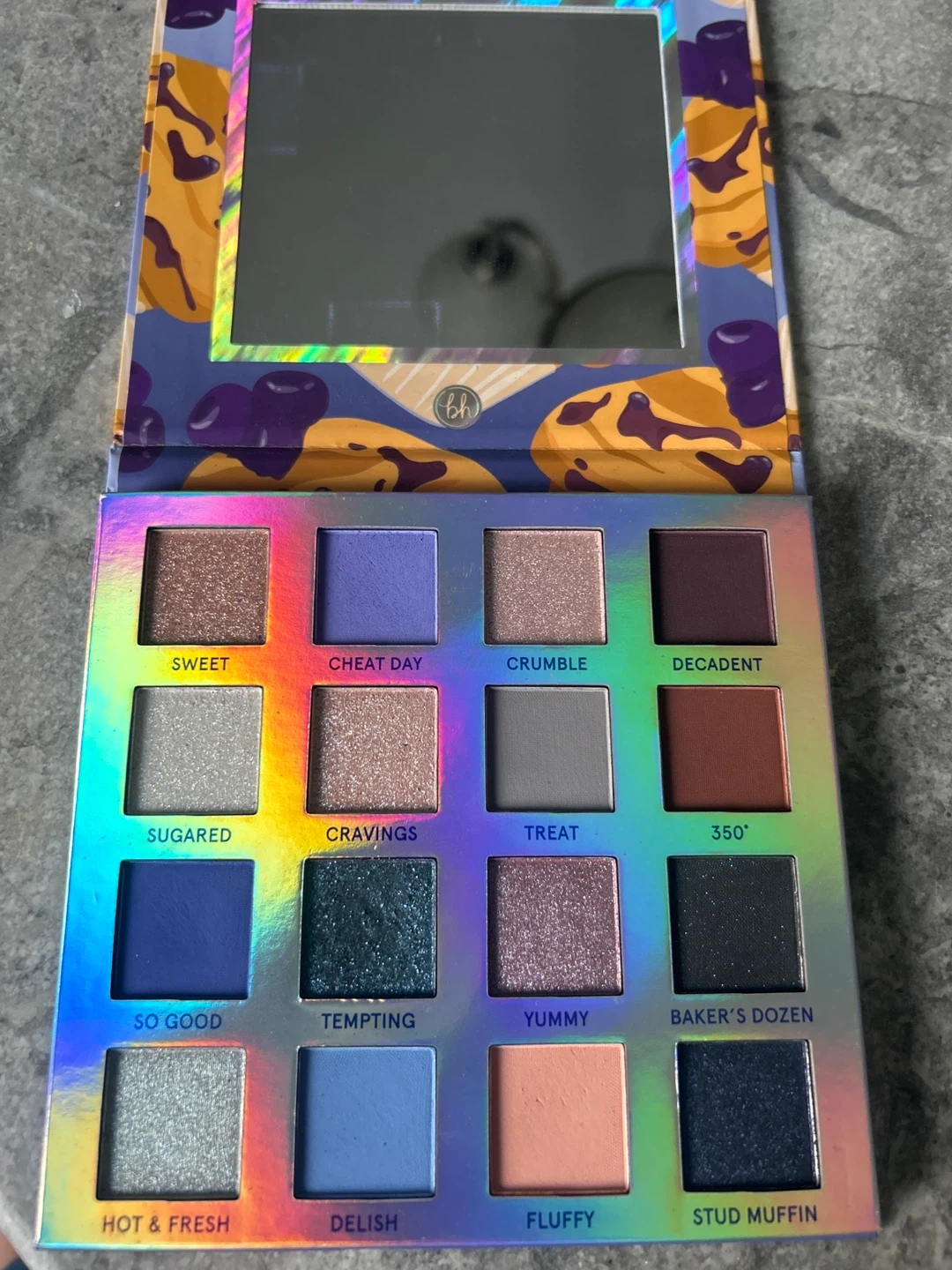 This BH Cosmetics eyeshadow palette features 16 shades inspired by blueberry muffins. It includes a mix of matte and shimmer finishes. Colours range from deep blues to neutrals and warm browns.