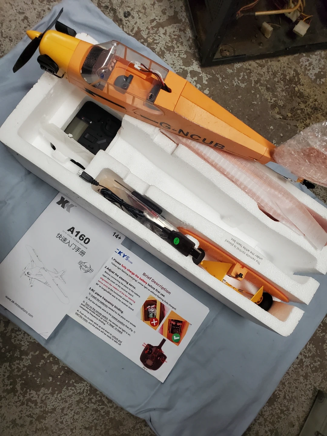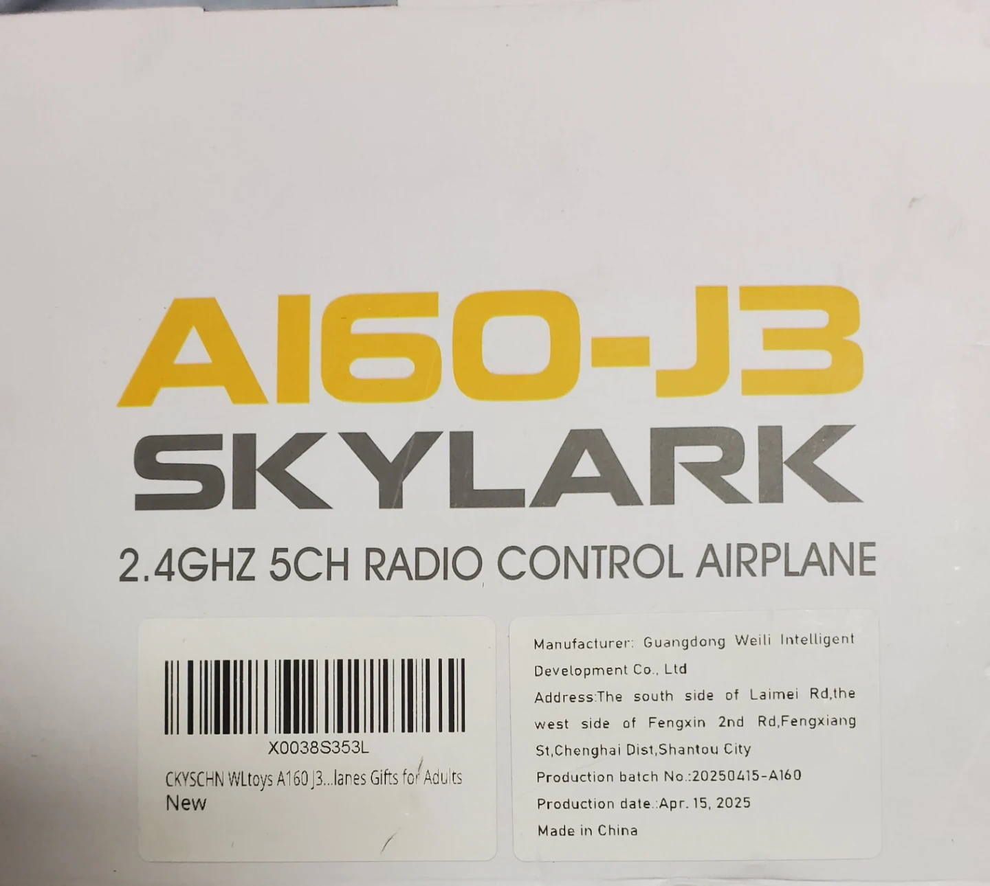 This is the XK A160-J3 Skylark 2.4GHz 5CH radio control airplane. It features 3D aerobatic flight mode and 6G parallel flight, altitude control and automatic stabilization mode. EPP material is very resistant to impact! Never used, all there!