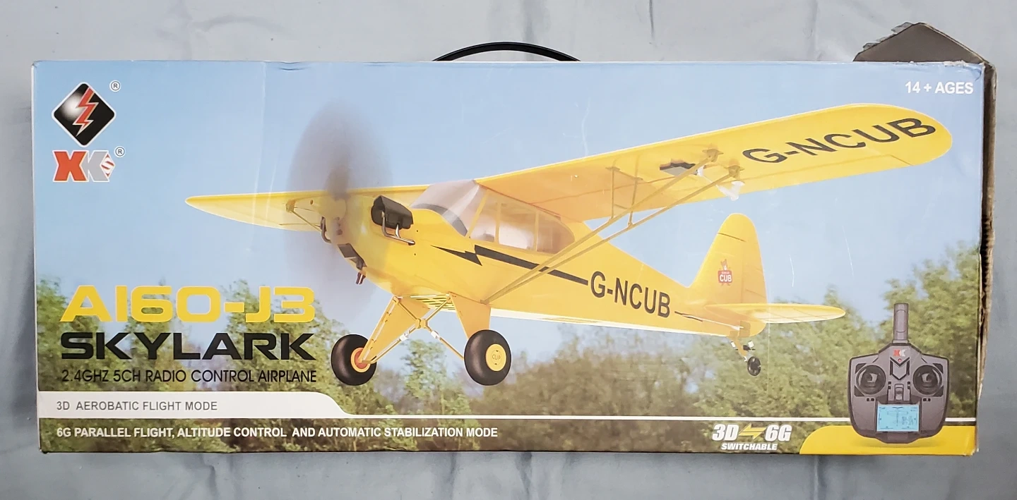 This is the XK A160-J3 Skylark 2.4GHz 5CH radio control airplane. It features 3D aerobatic flight mode and 6G parallel flight, altitude control and automatic stabilization mode. EPP material is very resistant to impact! Never used, all there!