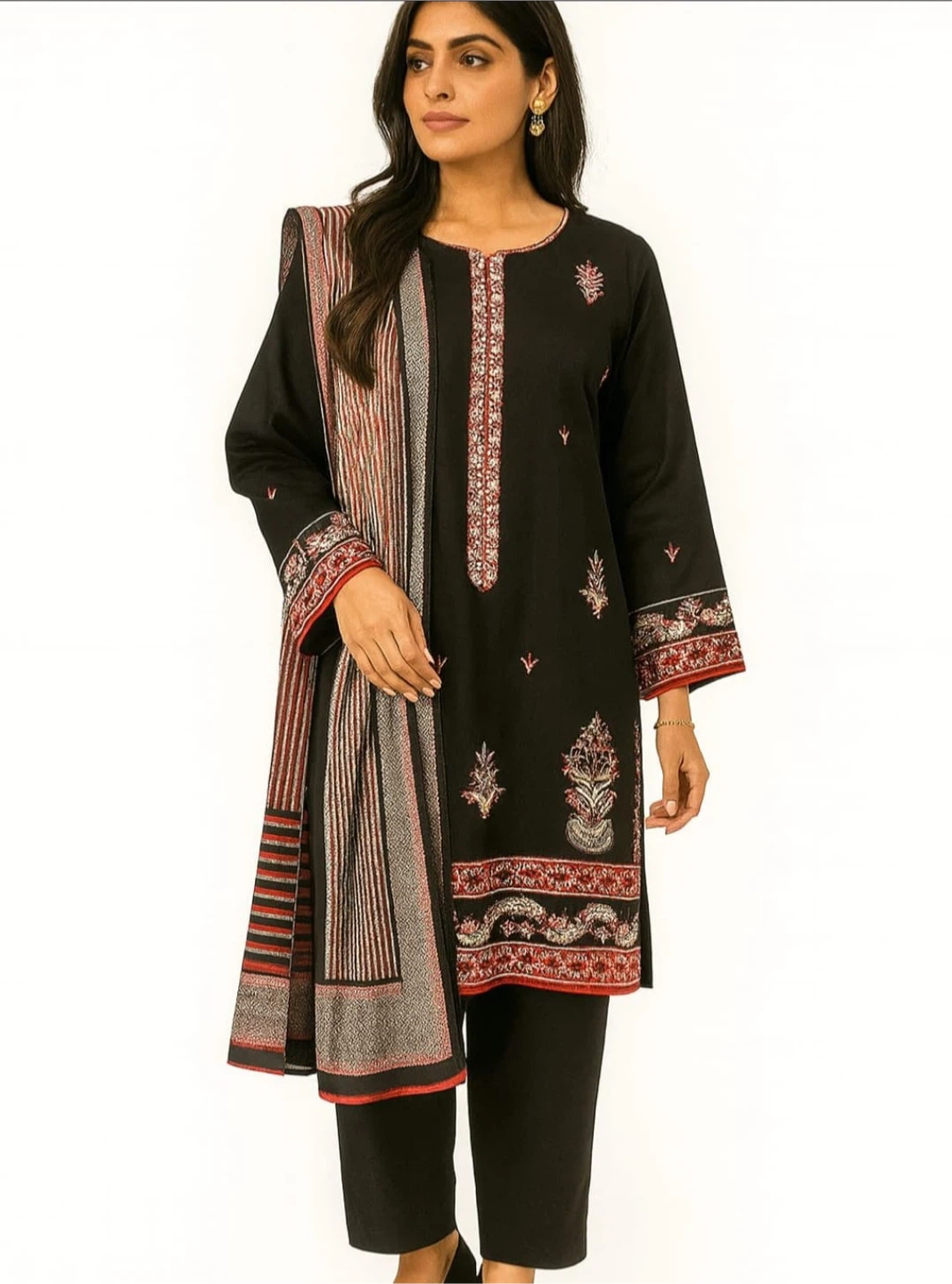 This is a beautiful black Eastern designer wear suit. It features intricate embroidery and comes with a matching shawl and pants. Perfect for a special occasion or everyday wear!