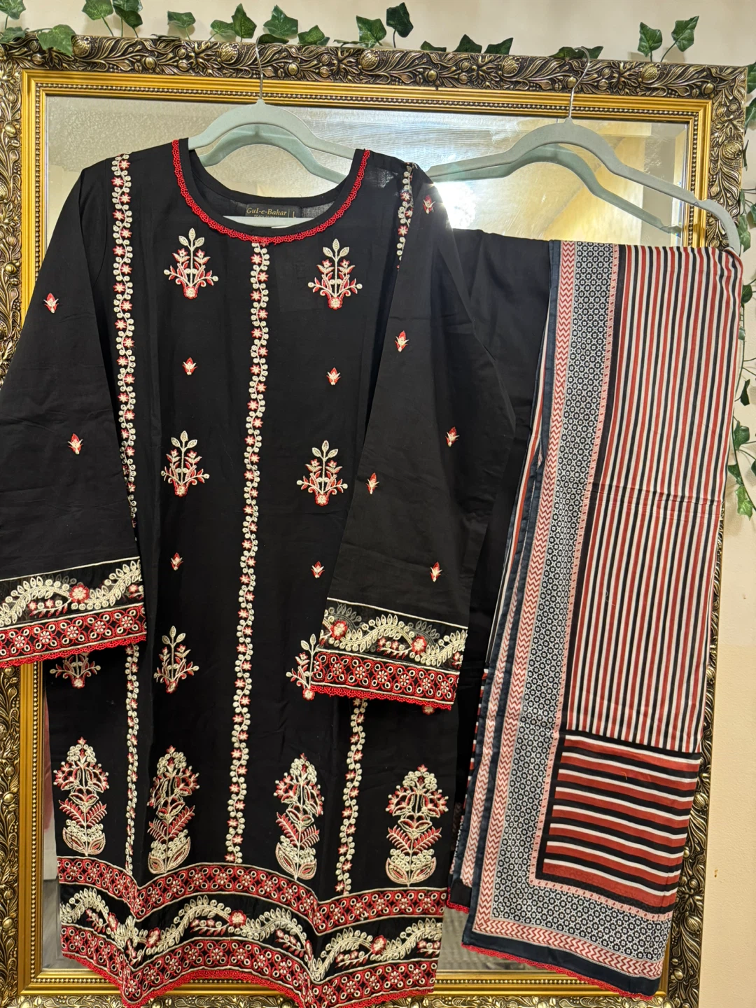 This is a beautiful black Eastern designer wear suit. It features intricate embroidery and comes with a matching shawl and pants. Perfect for a special occasion or everyday wear!