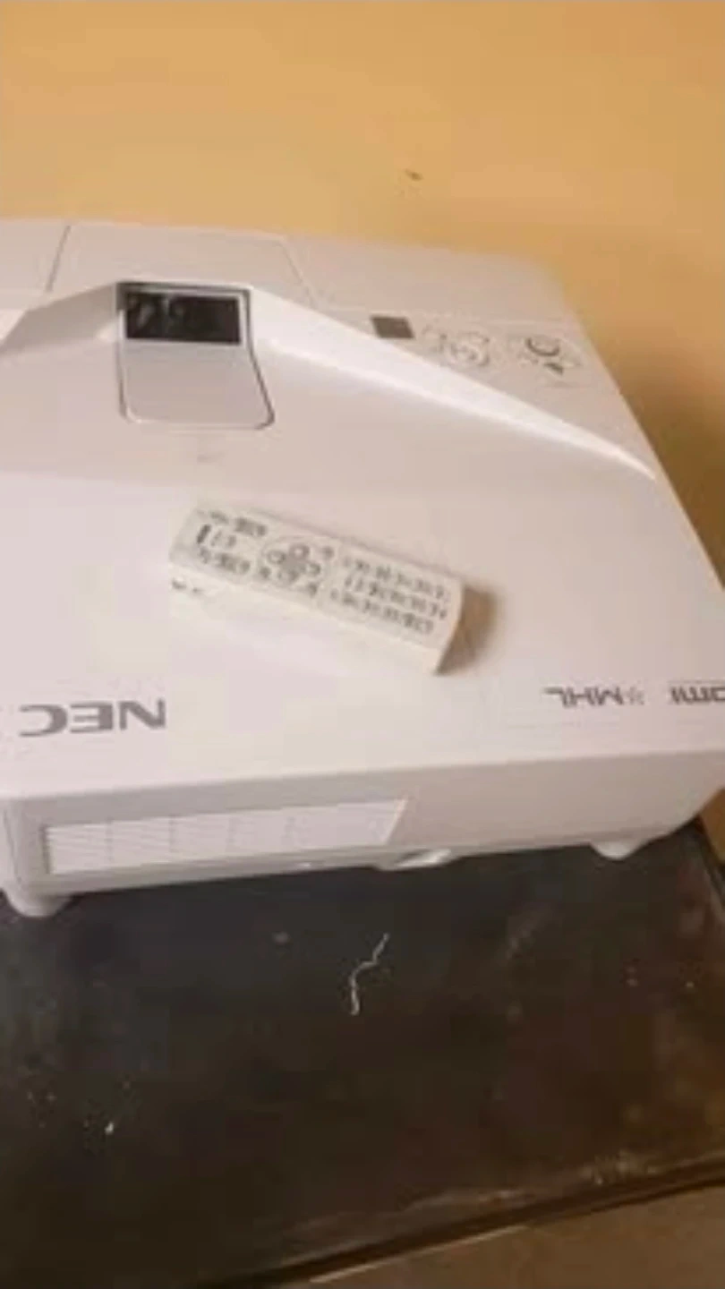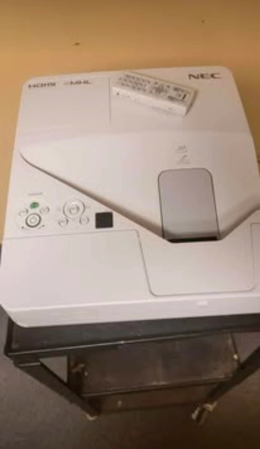 It features a super short throw lens, allowing for large images to be projected from a short distance. New bulb installed! Remote control and power cord are included. It's in like-new condition.