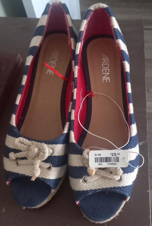 These cute Ardene espadrille wedges are in great condition! They feature a nautical blue and white stripe pattern, a jute wedge heel, and lace-up detailing. Size 9