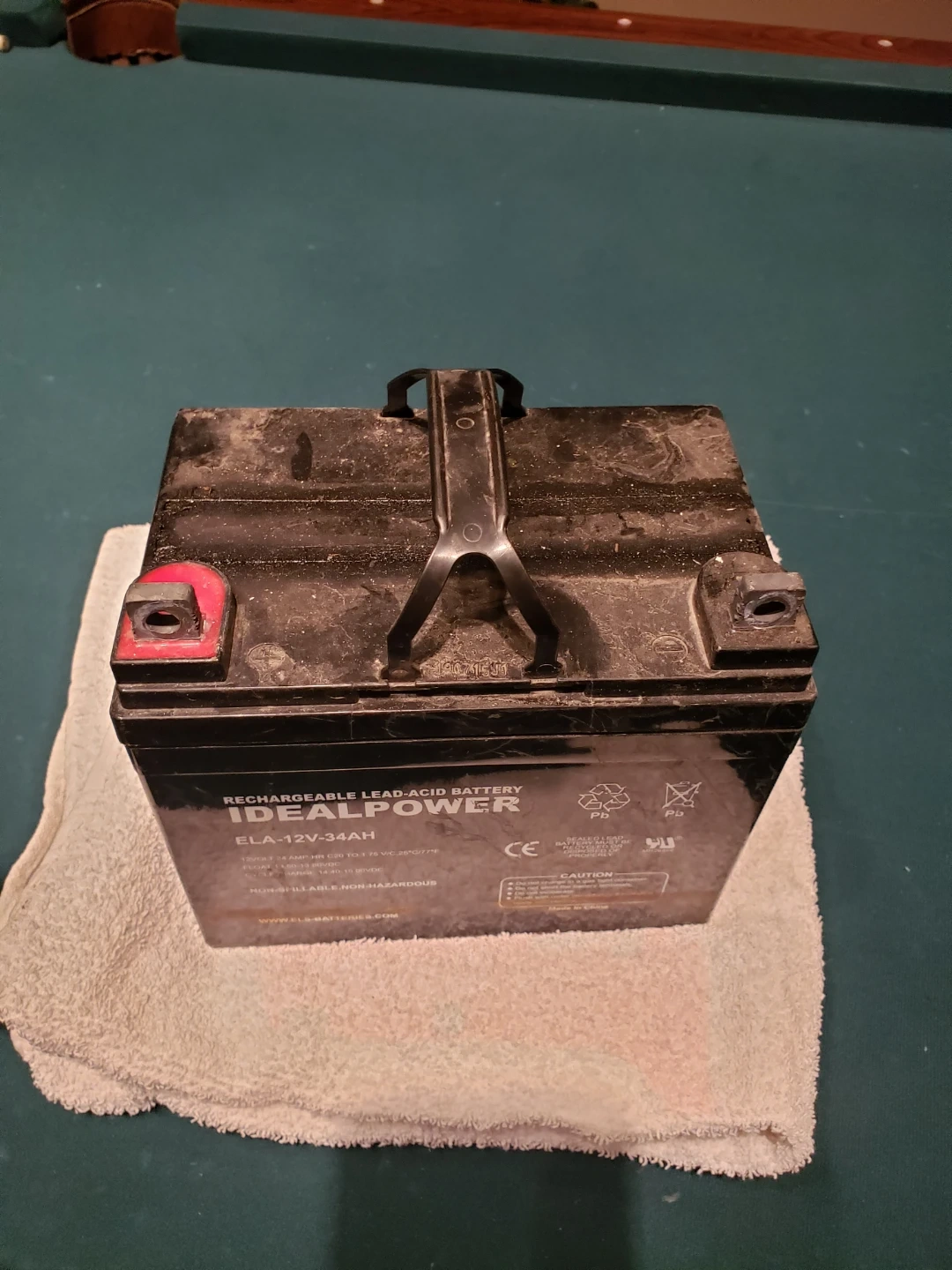This is an Idealpower rechargeable lead-acid battery. It's a 12V 34AH unit with model ELA-12V-34AH. It's non-spillable and non-hazardous. This battery is suitable for various applications requiring a 12V power source.