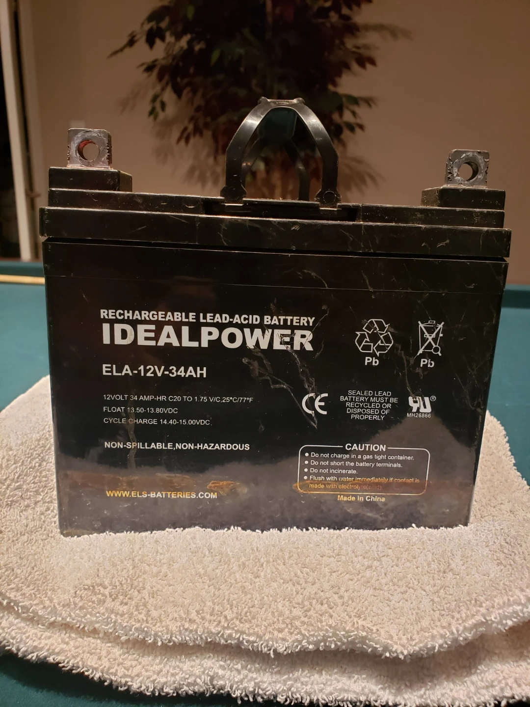 This is an Idealpower rechargeable lead-acid battery. It's a 12V 34AH unit with model ELA-12V-34AH. It's non-spillable and non-hazardous. This battery is suitable for various applications requiring a 12V power source.