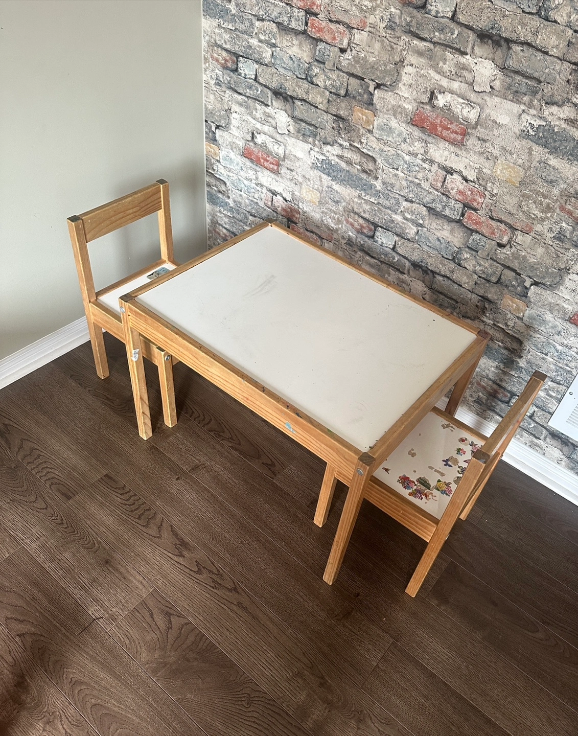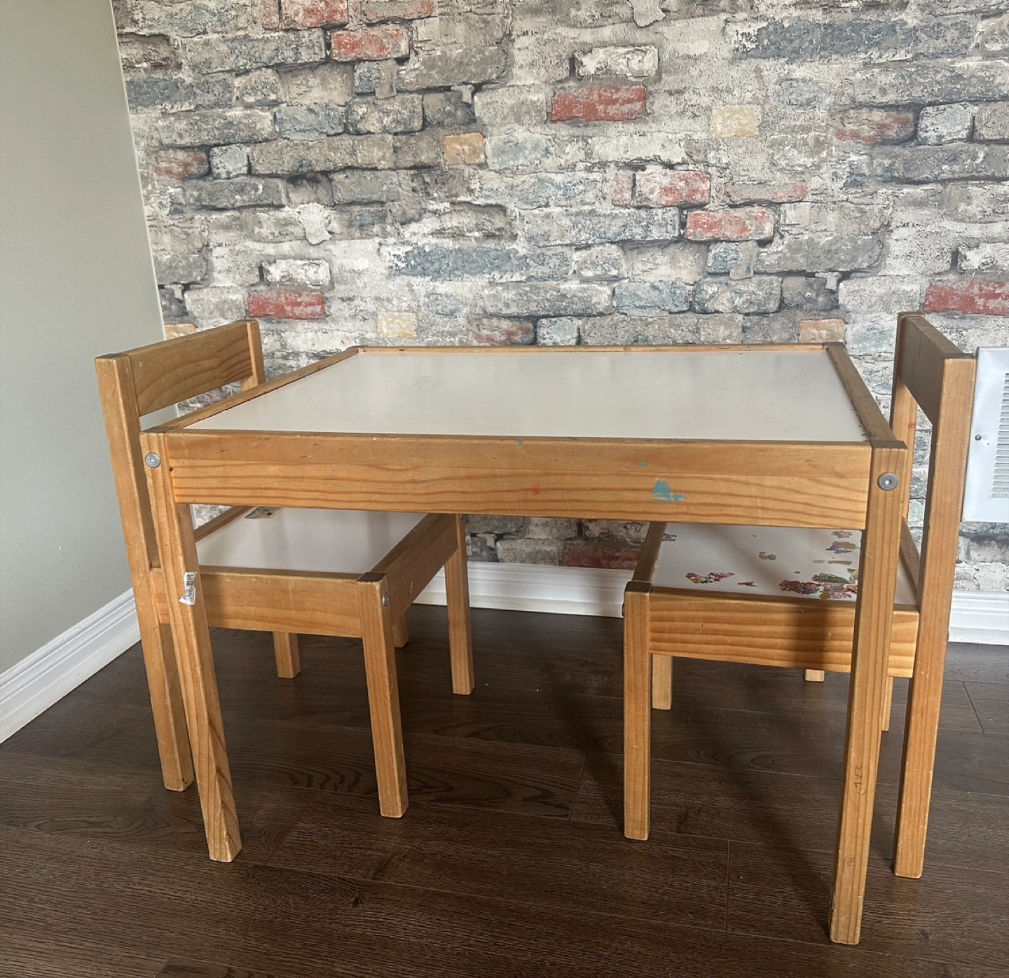 Selling IKEA children's table with one matching chair. Perfect for arts and crafts, snack time, or homework! The table has a smooth, easy-to-clean surface, and the chairs are sturdy and comfortable for little ones. There are some minor signs of wear, but overall it's in good condition and ready for a new home.