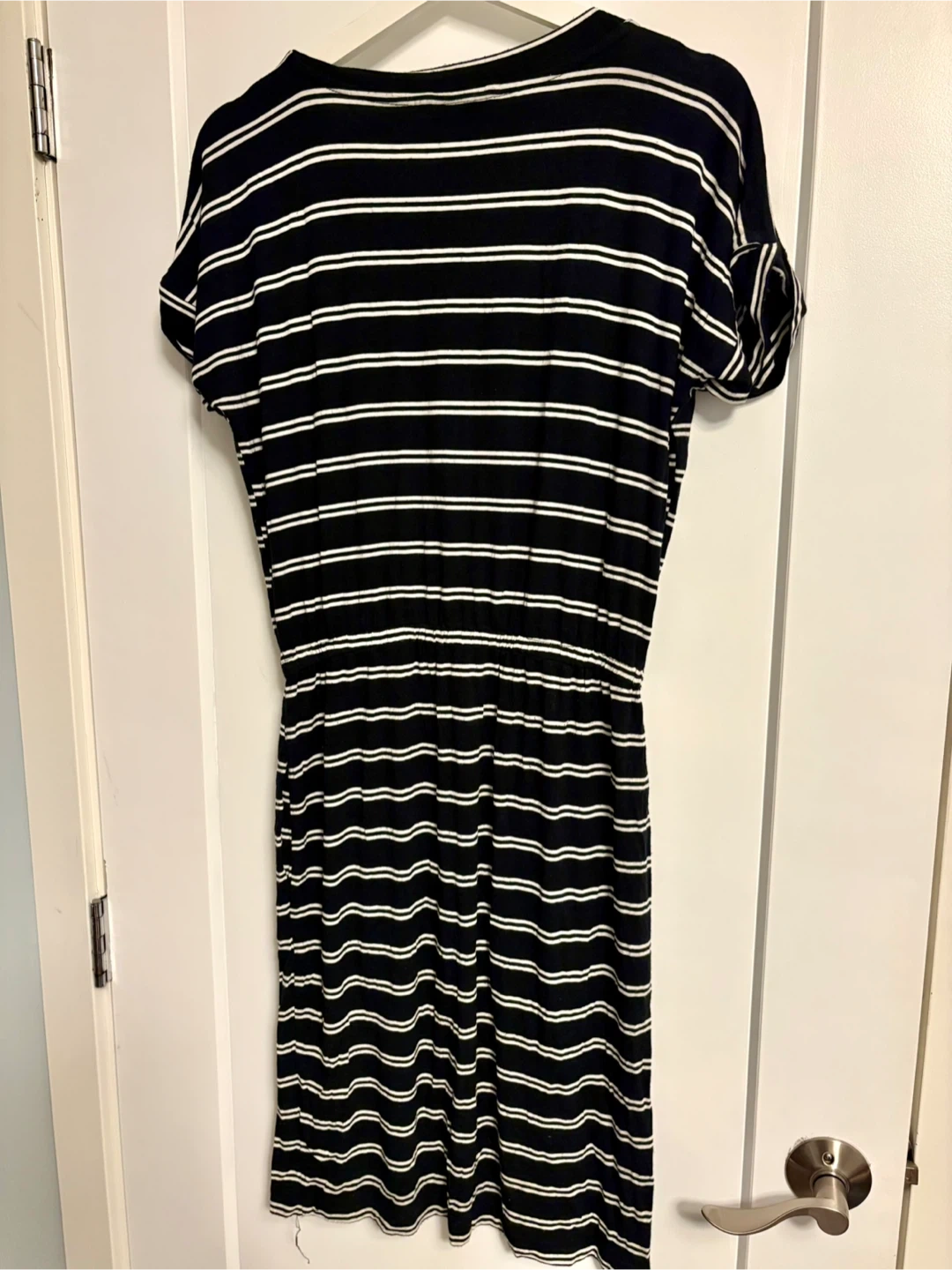 This Banana Republic jersey dress features a classic navy and white stripe pattern. It has a comfortable V-neck and an elasticized waist for a flattering fit. Made from soft, breathable fabric, it's a casual staple for everyday wear. Fits quite relaxed more like a medium .
