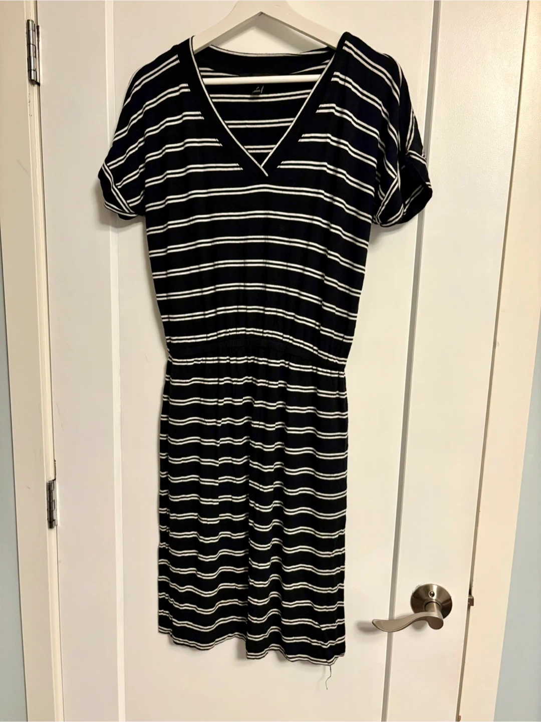 This Banana Republic jersey dress features a classic navy and white stripe pattern. It has a comfortable V-neck and an elasticized waist for a flattering fit. Made from soft, breathable fabric, it's a casual staple for everyday wear. Fits quite relaxed more like a medium .