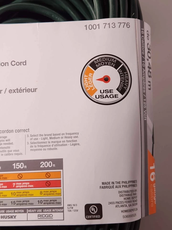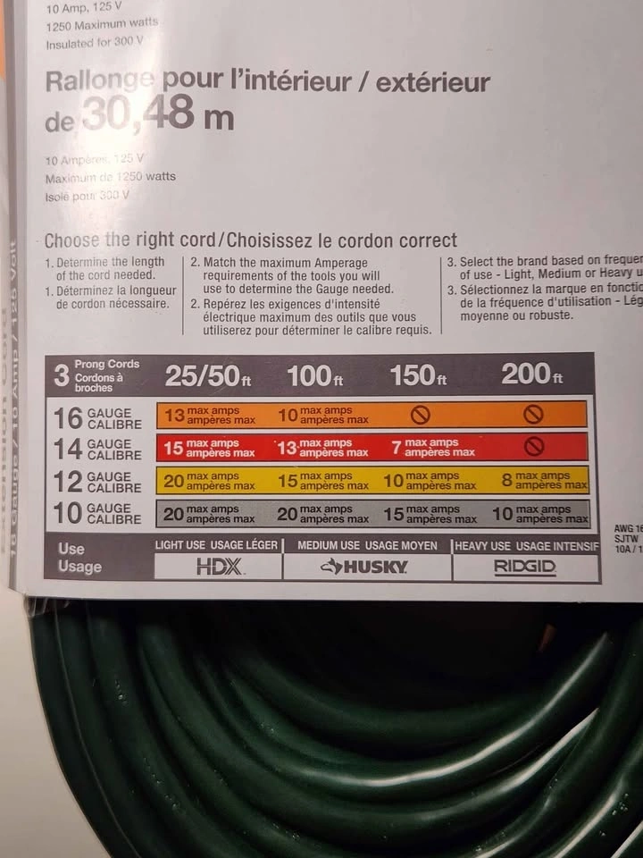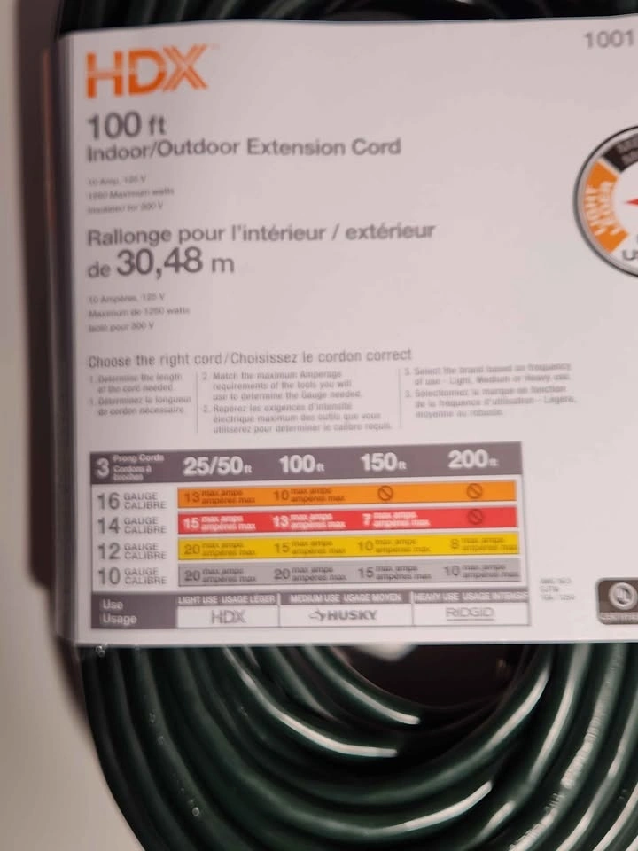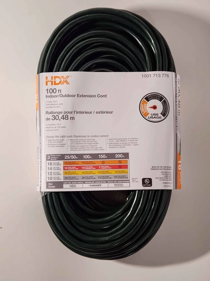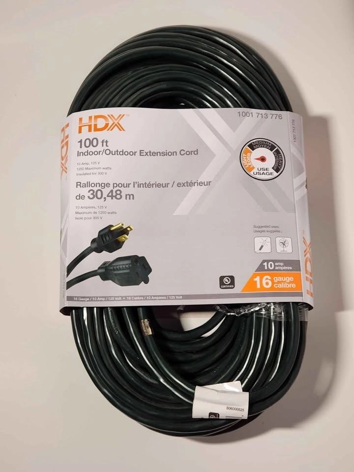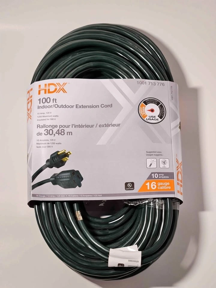 Brand new HDX 100 ft extension cord. Great for indoor or outdoor use. It is a 16 gauge cord, 10 amp, 125 volt, with 1250 max watts. Perfect for your projects! Pick up location is between Sheppard and Jane Street.