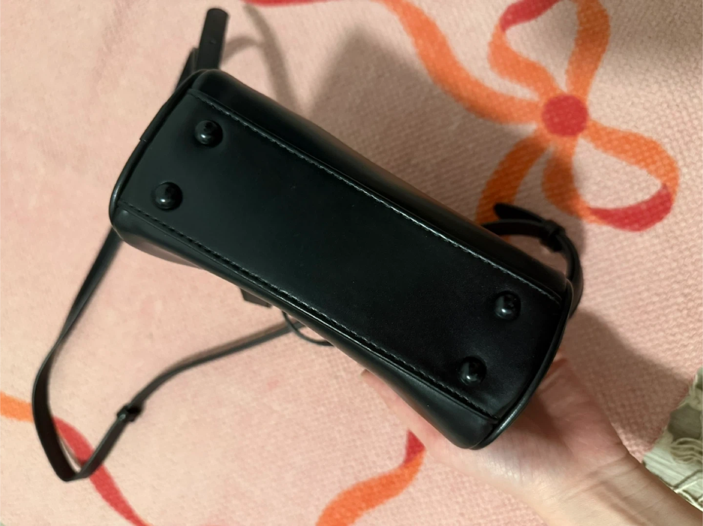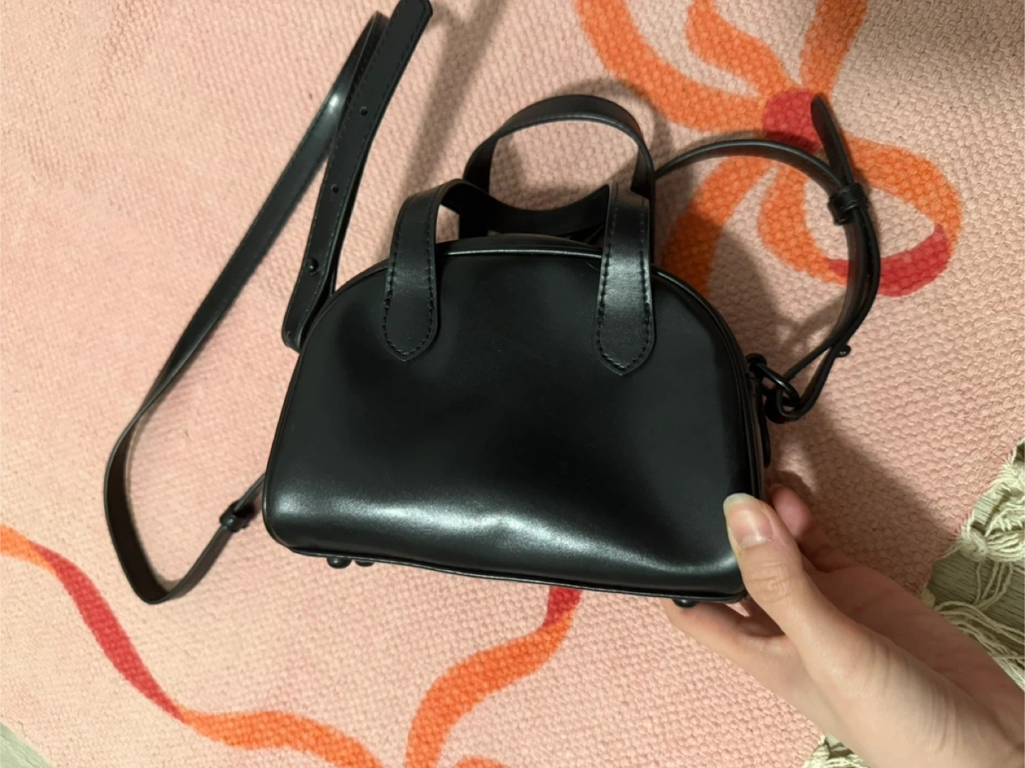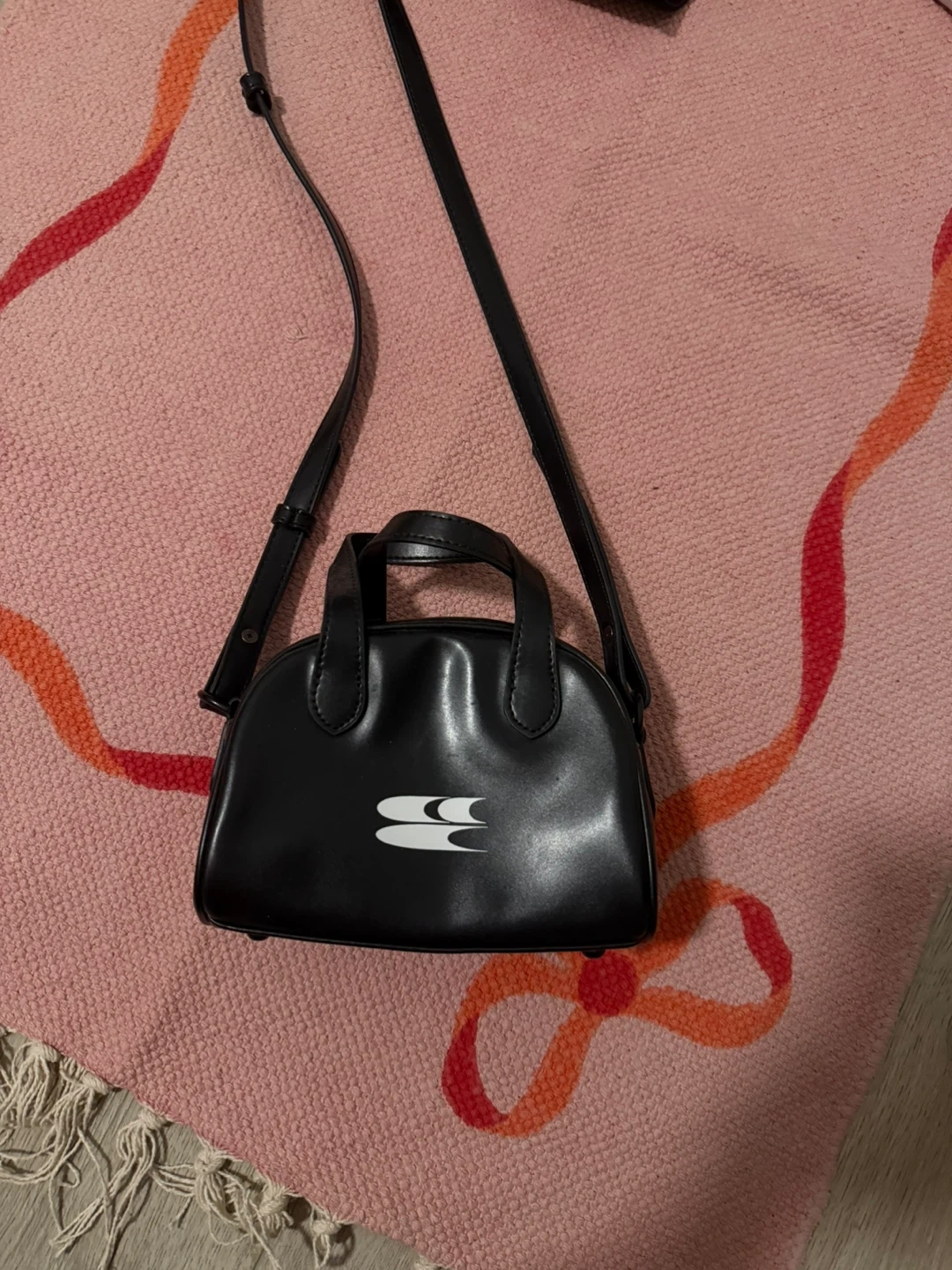 This is a Crying Center black mini bag. It's made of faux leather with a zip closure. Includes a removable shoulder strap.