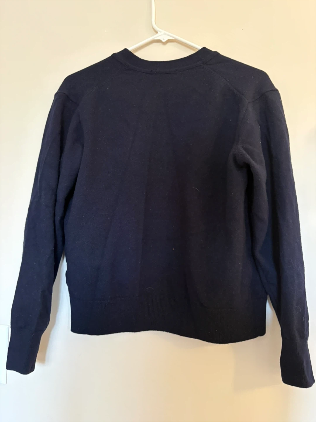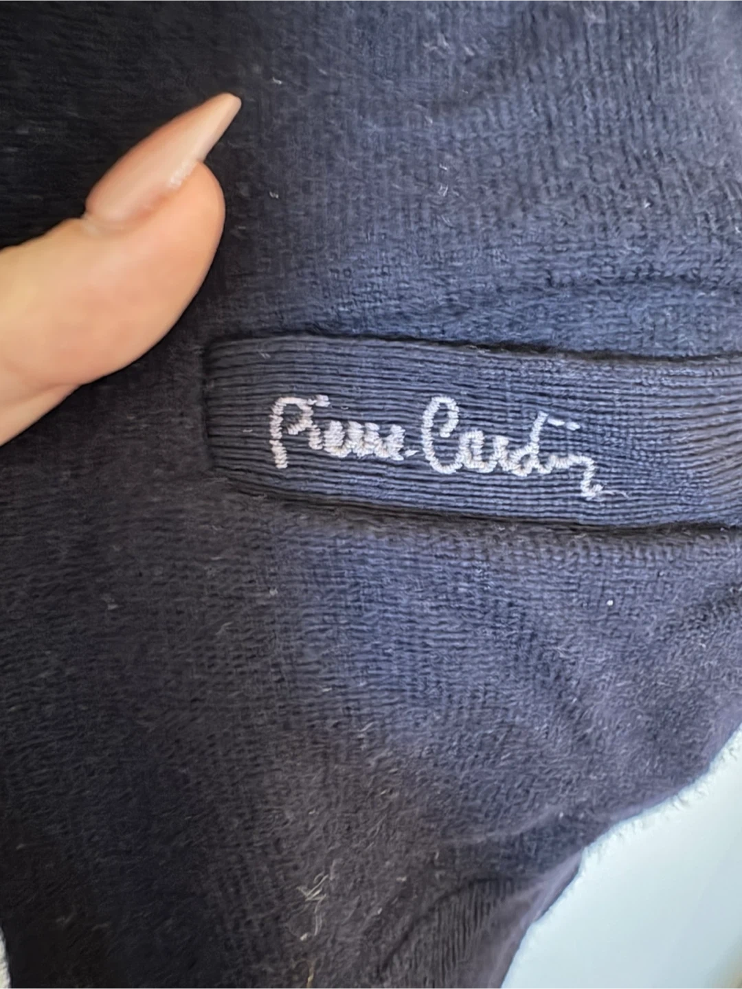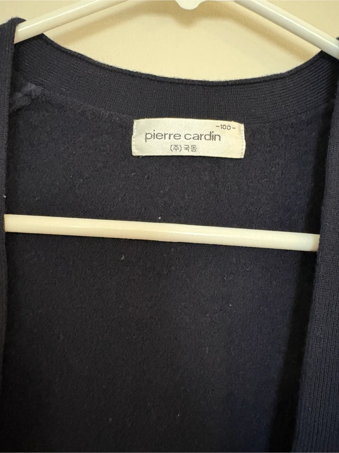 A dark blue Pierre Cardin cardigan. It's a size 100, made from a soft material. This classic piece is great for layering during cooler weather.