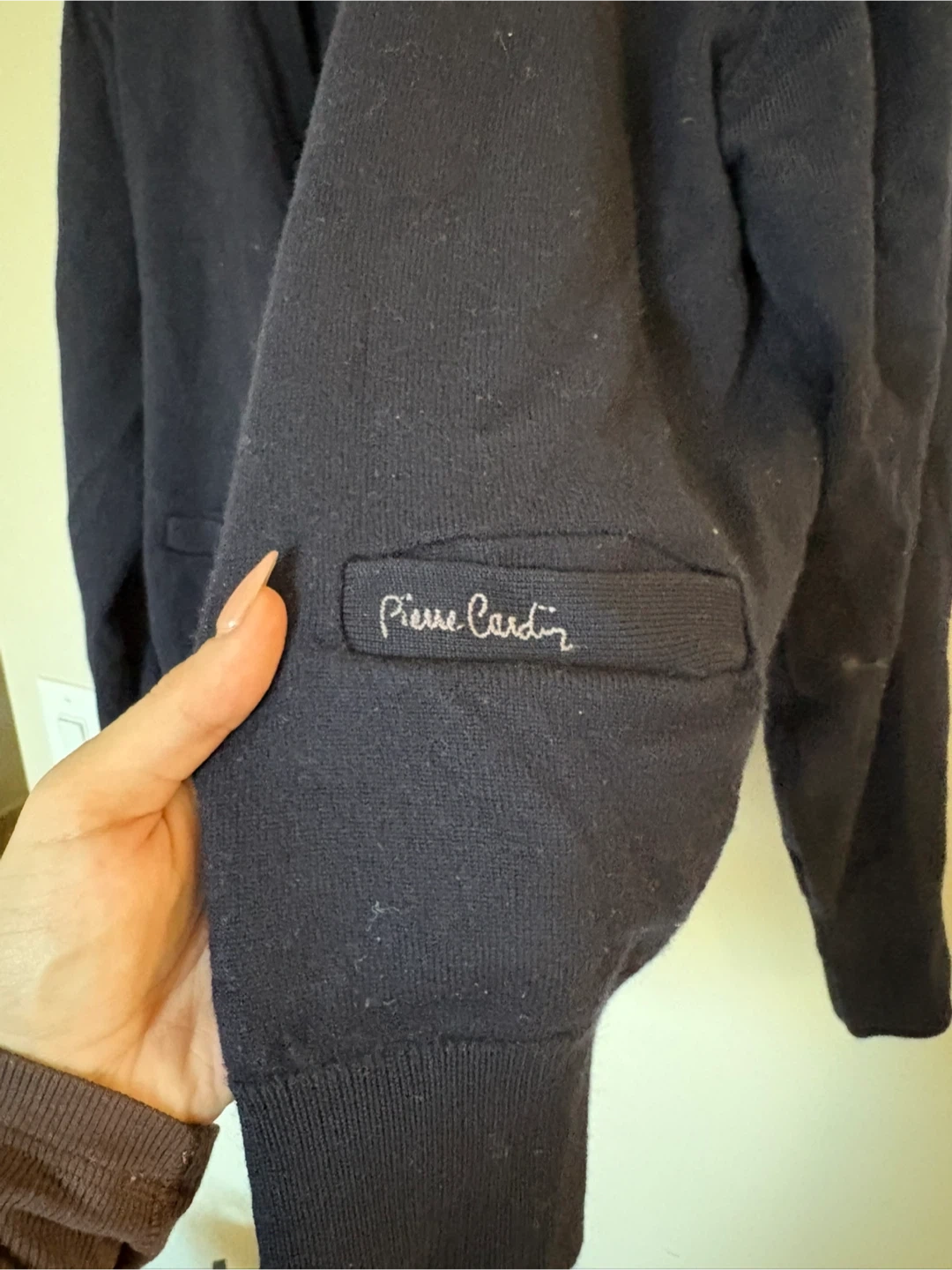A dark blue Pierre Cardin cardigan. It's a size 100, made from a soft material. This classic piece is great for layering during cooler weather.