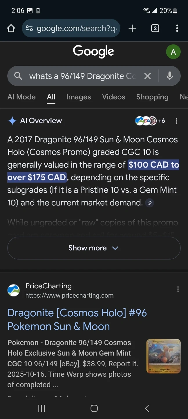175 or best offer A 2017 holo Dragonite Sun & Moon Cosmos Holo (Cosmos Promo) graded CGC 10. It's a Gem Mint condition card from the Sun & Moon expansion. This card is highly valued by collectors!