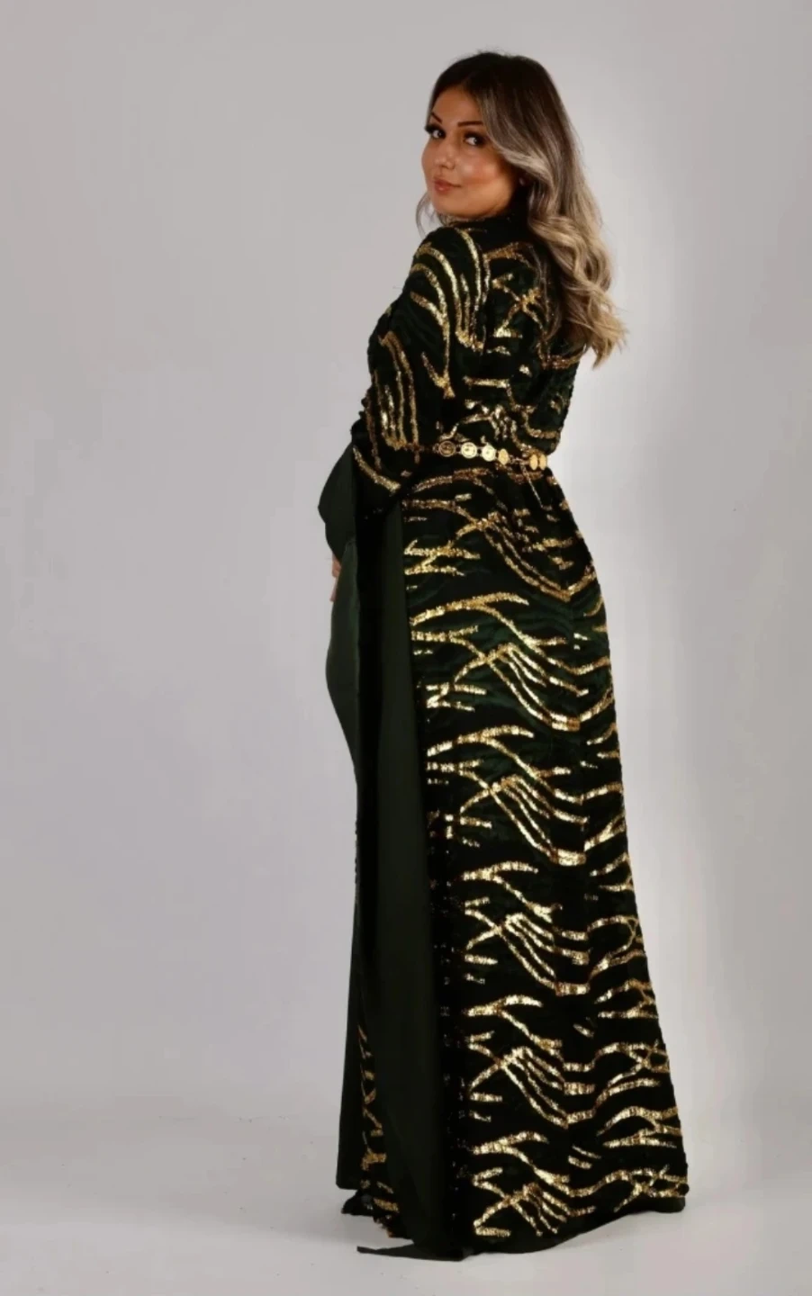 Flowing abaya with intricate embroidery or dazzling sequin patterns. Features a luxurious velvet or satin finish. Comes with a stylish gold belt. Perfect for special occasions! Size M L And XL available pre-order for more styles pm price per dress start 250$