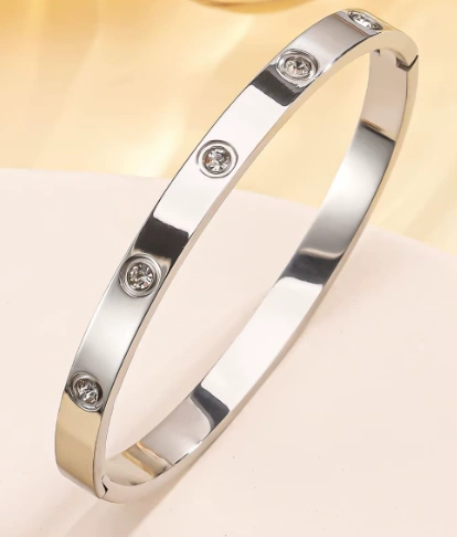 Material: stainless steel with crystal accents (no tarnish look, easy to maintain)