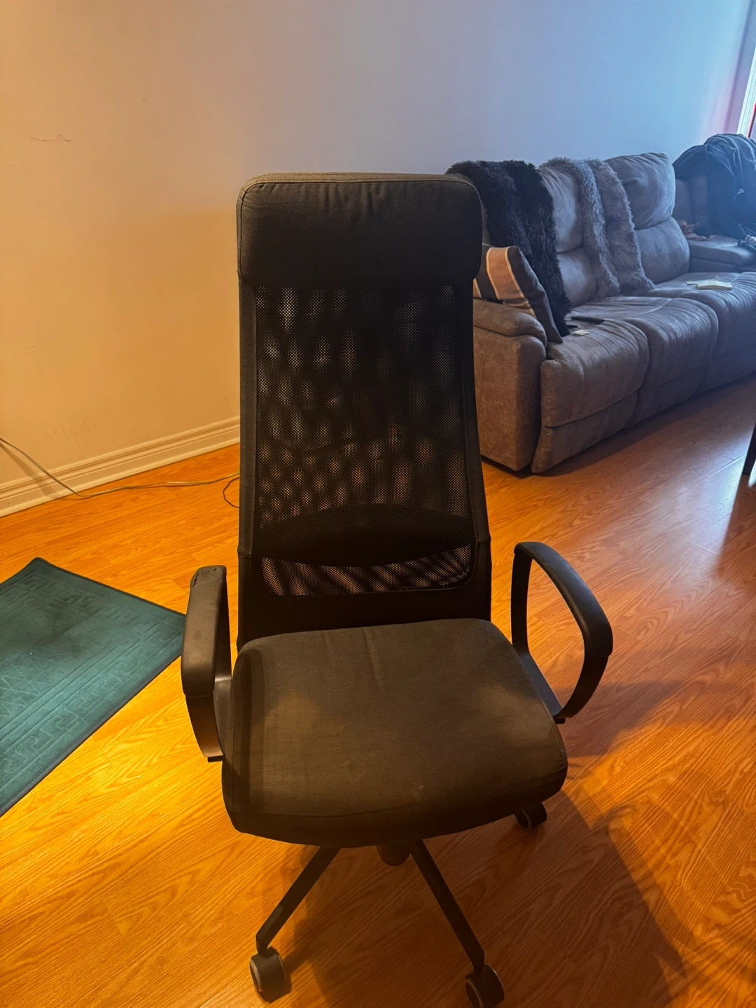 This is an IKEA MARKUS office chair in black. It features a breathable mesh back and a comfortable padded seat. The chair is adjustable for height and tilt. It's great for long hours of work or study!