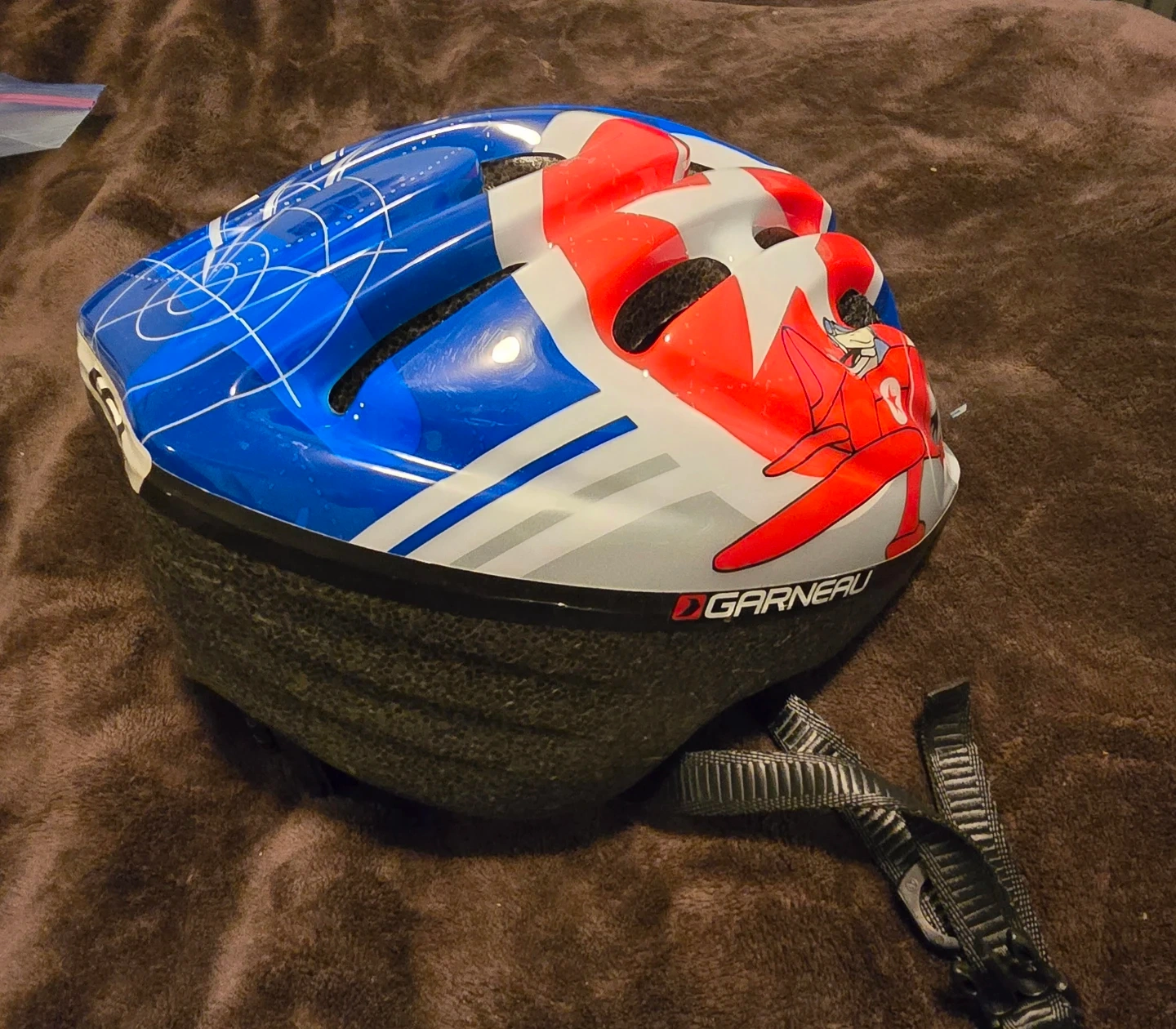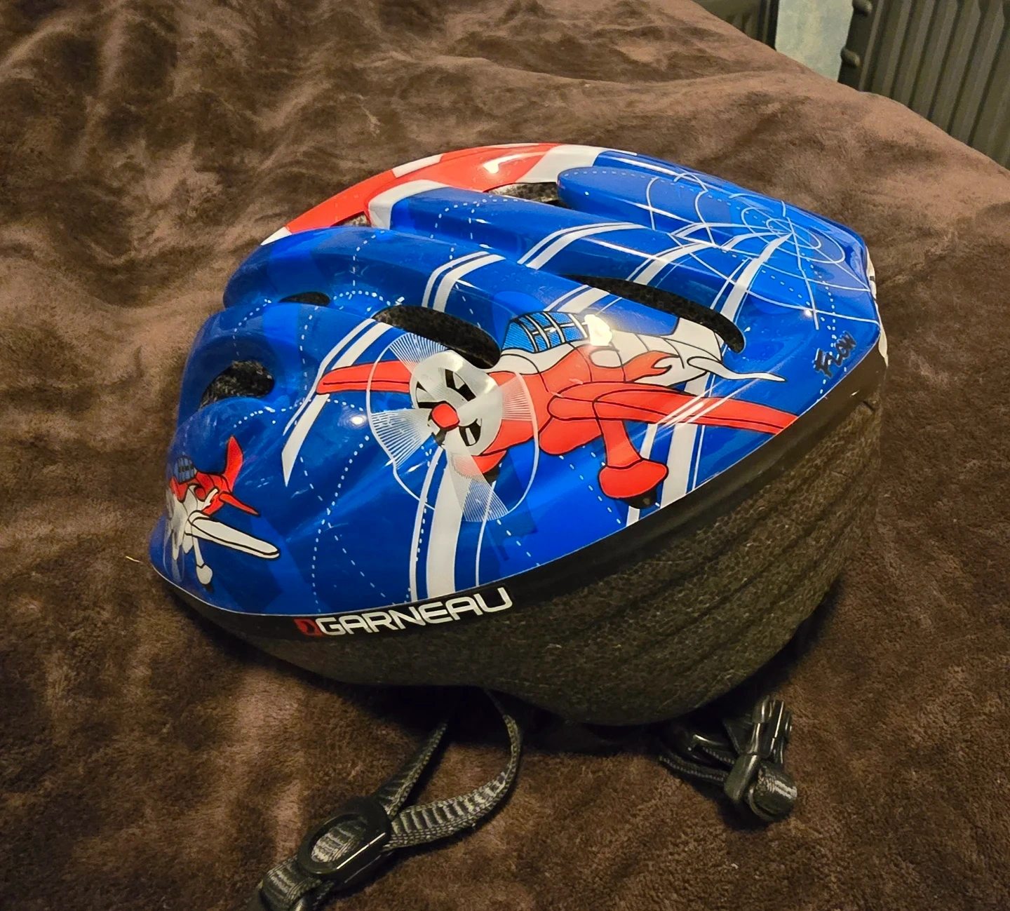 Selling a Garneau kids' bike helmet. It's in great shape and ready for your little one's adventures! The helmet features a fun airplane design in red, white, and blue.