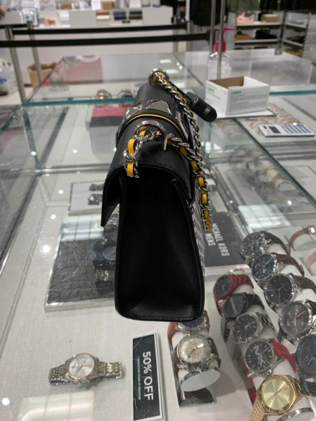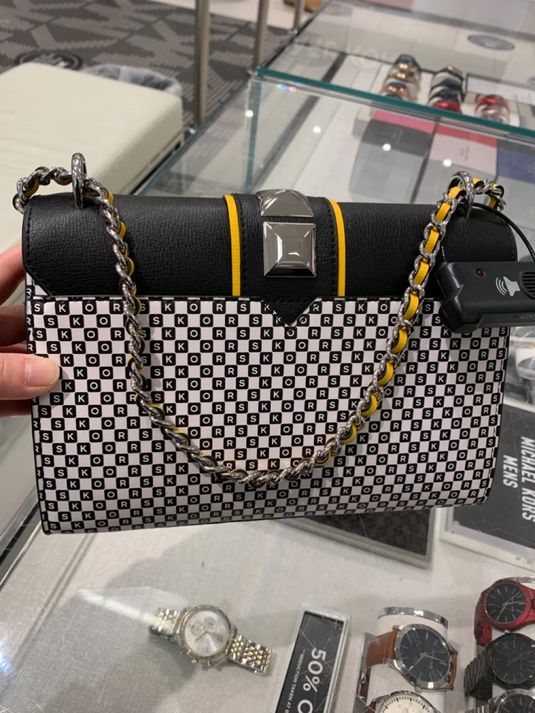 Here's a stylish Michael Kors crossbody bag! It features a black and white checkered pattern with the MK logo, accented with yellow details on the chain strap. The bag is in great condition and ready for a new home