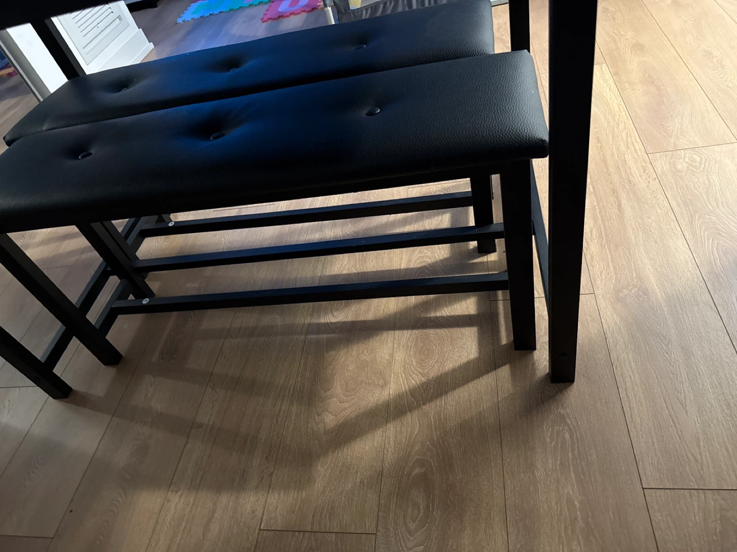 Selling a dining table set with two benches! The set is black and would look great in any dining room or kitchen. The benches are padded for extra comfort, making meal times more enjoyable! (Price negotiable☺️)