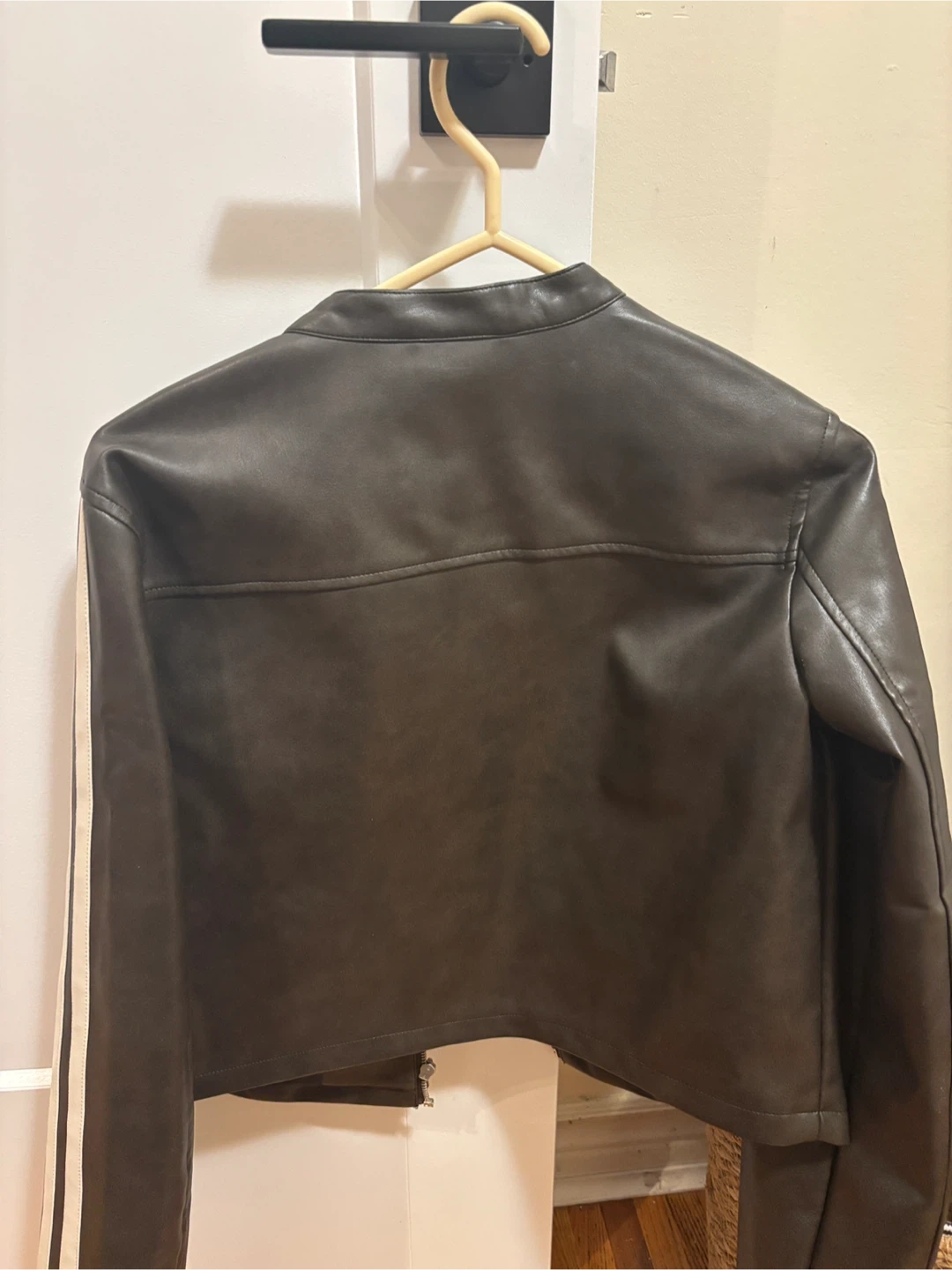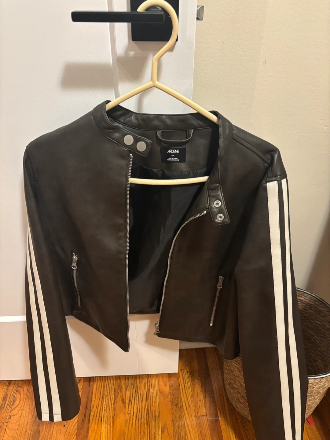 Selling a brown faux leather jacket from Ardene. It features white stripes (looks cropped but isn’t). Perfect for adding a stylish touch to any outfit!