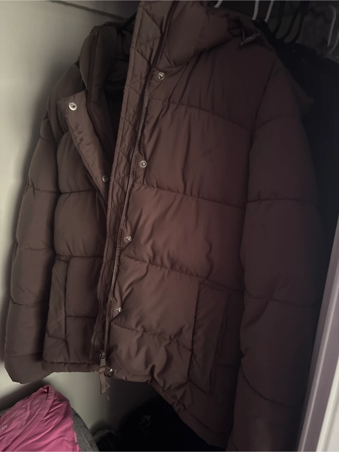 10A cozy brown puffer jacket, perfect for staying warm during the colder months! It's in great condition and ready for a new home. wore once